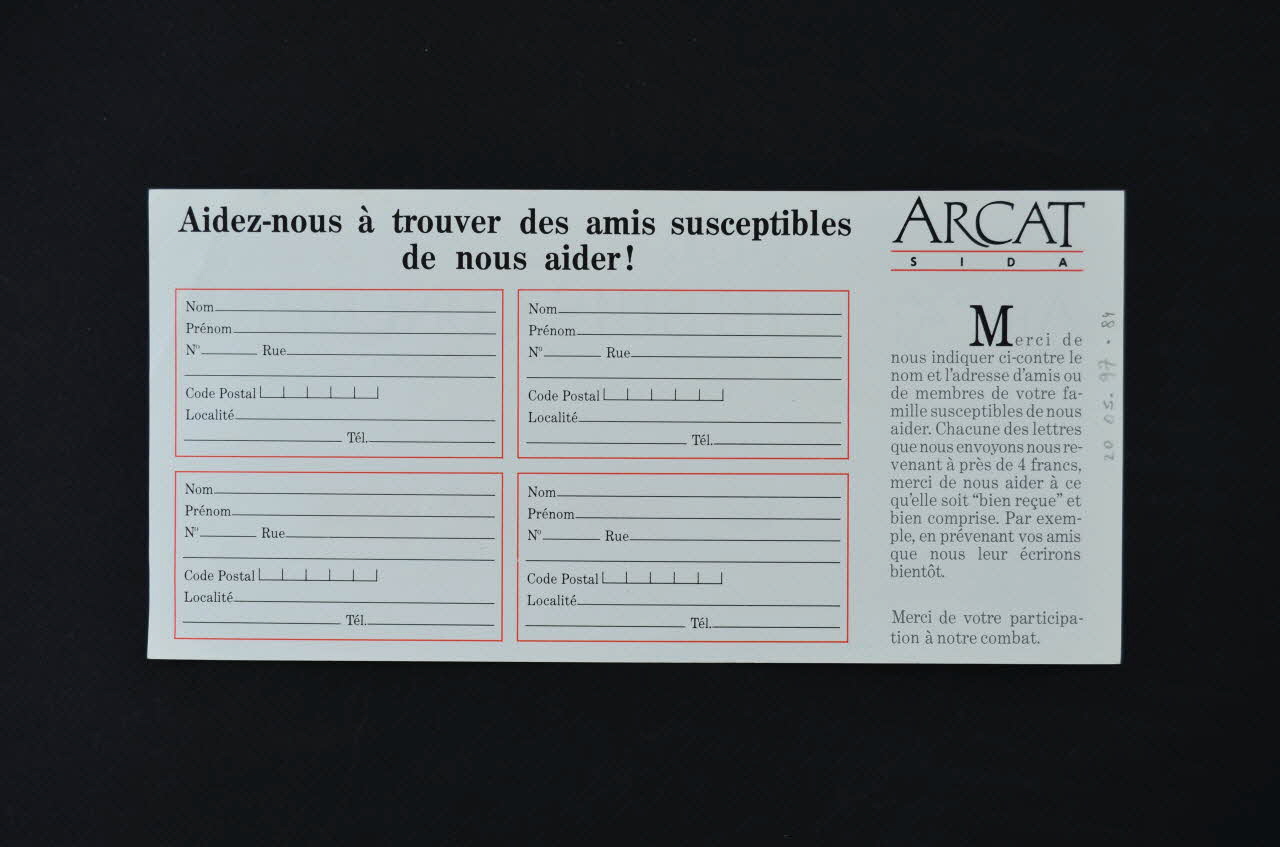 Je soutiens votre action et vous invite à trouver ci-joint mon réglement de : // [...] // // Aidez-nous à trouver des amis susceptibles // de nous aider ! // // Merci de nous indiquer ci-contre le nom et l'adresse d'amis ou de membres de votre famille susceptibles de nous aider. Chacune des lettres que nous envoyons nous revenant à près de 4 francs, merci de nous aider à ce qu'elle soit "bien reçue" et bien comprise. Par exemple, en prévenant vos amis que nous leur écrirons bientôt. // // Merci de votre participation à notre combat. (et verso), rectoLogo