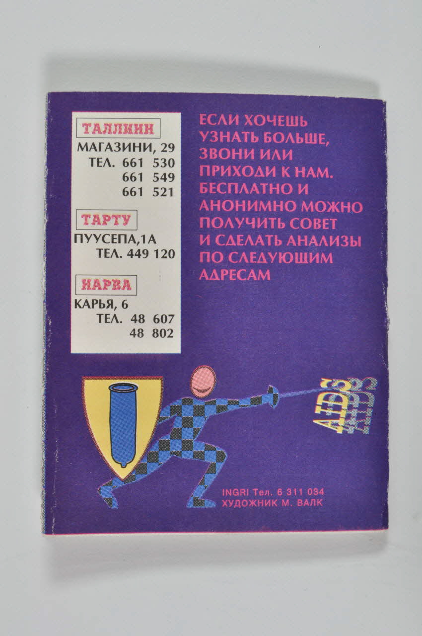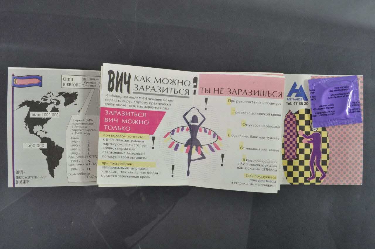 La couverture est violette. Au recto, à gauche, verticalement, un préservatif rose avec une base bleue est surmonté d'une silhouette rose et bleue. Elle s'apprête à lancer un javelot vers la droite. Toute la partie droite du feuillet est occupée par des inscriptions en caractères cyrilliques jaunes et grises. Au recto, à gauche, un rectangle blanc a reçu des inscriptions rouges et noirs, indiquant des numéros de téléphone pour des centres d'aide et d'information. A droite, en rose, sont inscrites des recommandations pour le test de dépistage anonyme. En bas, en motifs bleus, noirs, roses et jaunes, une silhouette tient d'une main un bouclier avec un dessin de préservatif et de l'autre une épée terrassant le mot "AIDS". L'intérieur est très coloré, avec de nombreuses inscriptions et illustrations sur chaque page. Elles se présentent comme suit: page 1 avec un fond composé de petits carrés bruns, sur lequel se détache une silhouette rose tenant un préservatif long bleu au bout d'une ligne. Devant elle, un petit amour avec une flèche. Au-dessus, une inscription en noir dans une bulle blanche. Le premier rabat interne présente une carte du monde en noir et blanc avec données épidémiologiques pour 1993 et 1994, inscrites en noir dans des rectangles blancs. La page 2 est couverte d'inscriptions dans des dimensions et couleurs différentes. La page 3 également, avec un texte noir sur fond balnc rectangles rose et jaune. La page 4 présente, à droite, un petit personnage jaune avec des points noirs envoyant un ballon dans un panier de basket gris en forme de préservatif. A gauche, verticalement, un texte en caractères blancs se détache sur un fond rose. Les pages 5 et 6 constituent une double page. Sur un fond blanc, au centre, est représentée une silhouette de danseuse au centre d'un cercle orné de petits préservatifs roses, violets et jaunes. Autour se développe un texte en lettres noires, avec des sous-titres surlignés en jaune et rose. Les pages 7 et 8 constituent une double page. En haut, un petit bandeau rose est représenté avec une inscription en noir. En dessous, sur un fond blanc parsemé de AIDS en sous impression, se développe un texte en lettres noires, certaines surlignées de jaune, soulignées ou encadrées de rose, et des lettres blanches sur fond noir. En bas de la page 8, une silhouette jaune s'apprête à renter dans un préservatif bleu à pois blancs. La page 9 reprend les mêmes écritures et tupologies que la double page précédente, avec, en bas, une silhouette violette faisant de l'équilibre au dessus d'un préservatif jaune avec des points bruns. Le rabat final présente, en noir sur fond blanc, des conseils de pose du préservatif, avec huit vignettes illustrées et légendées. Sur le feuillet droit, en bas, à gauche, une forme ovale quadrillée en jaune et noir contient une silhouette violette de boxeur se servant d'un préservatif rose avec damiers violets comme punching ball. La partie droite de la page est couverte d'un fond rose avec des disque roses plus foncés. En haut à droite, est collé le préservatif emballé dans une pochette violette. La page 10 présente un fond de carrés bleus emboités. Une silhouette jaune est représentée dessus, tenant une flèche blanche en forme de préservatif sous son bras gauche. A l'intérieur est illustré un bandeau rose avec une inscription en lettres blanches. La silhouette se dirige vers deux cygnes enlacés avec un petit coeur. En haut, une bulle blanche est remplie avec texte en lettres noires.Inscriptions