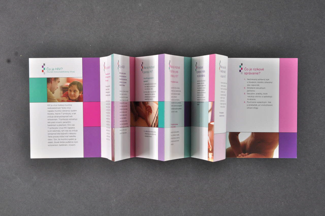Prevencia infekcie HIV/AIDS (Titre du dépliant au devant du dépliant), rectoCo je HIV? // [...] // Co je infekcia HIV? // [...] // Co je AIDS? // [...] // [...] (Titres des différentes parties du texte, alternant les couleurs roses, bleues, et violets), à l'intérieurConcernant le lieu d'impression