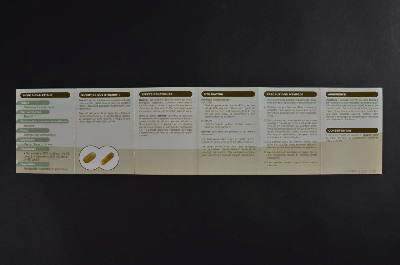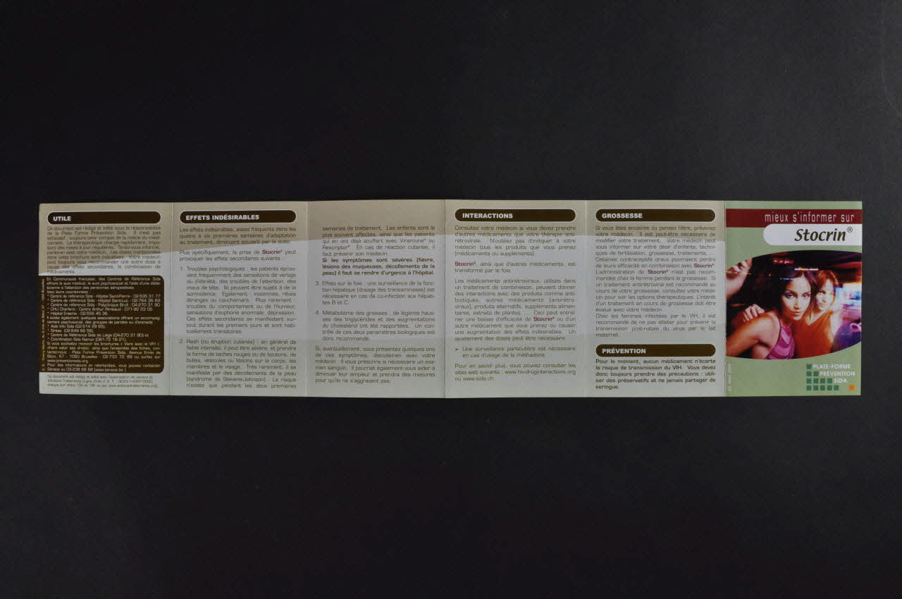 Mieux s'informer sur Stocrin (Titre du dépliant imprimé sur la couverture.)Fiche signalétique // Qu'est-ce que Stocrin ? // Effets bénéfiques // Utilisation // Précautions d'emploi // Adhérence // Conservation // Effets indésirables // Interactions médicamenteuses // Grossesse // Prévention // Utile (Titres des rubriques présentes dans le dépliant.)PLATE-FORME // PREVENTION // SIDA (Nom de l'association imprimé en bas à droite de la couverture.)Décor