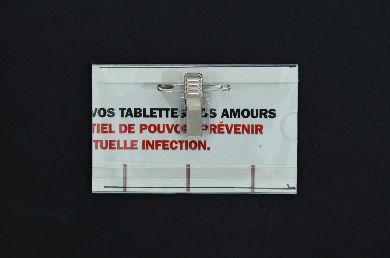 Badge, en plastique de forme rectangulaire qui se lit dans le sens horizontal. A l'intérieur est glissée une feuille de papier, imprimée en couleur. La partie en plastique est fermée, au verso, en bas, par de la colle. Sur la feuille de papier, en haut à gauche figure un slogan en petites capitales noires. En dessous, sur toute la largeur, un dessin représente trois préservatifs dans des pochettes de sucette tenus par une tige en bois barrée d'un ruban noir. Au verso de la feuille de papier, figurent des fragments de mots en noir et rouge sur un fond blanc. Au dos se trouve une pince en métal et en plastique transparent dans laquelle est glissée une épingle à nourrice.Décor