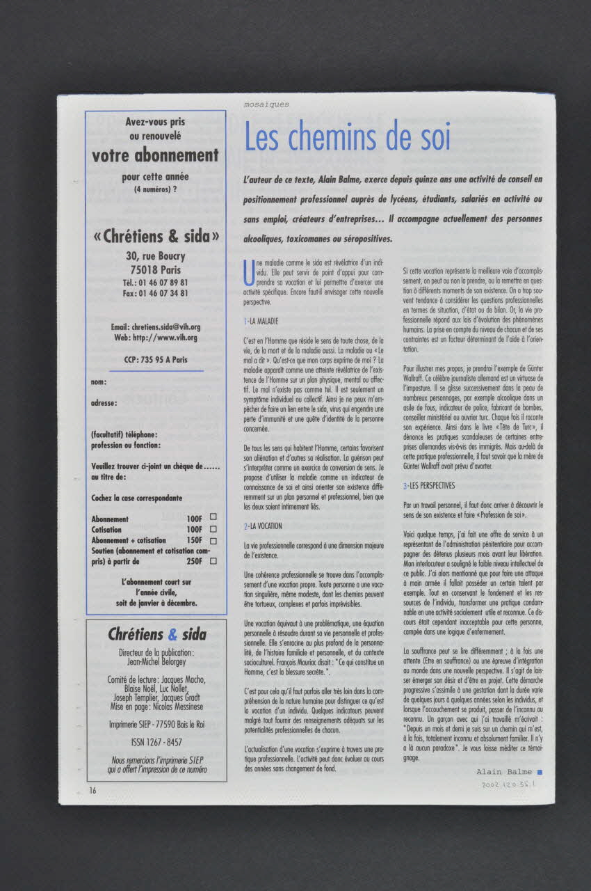 Chrétiens & sida // Directeur de la publication: // Jean-Michel Belorgey // // Comité de lecture: Jacques Macho, // Blaise Noël, Luc Nollet, // Joseph Templier, Jacques Gradt // Mise en page: Nicolas Messinese // // Imprimerie SIEP - 77590 Bois le Roi (dernière page, encadré), en basTitre