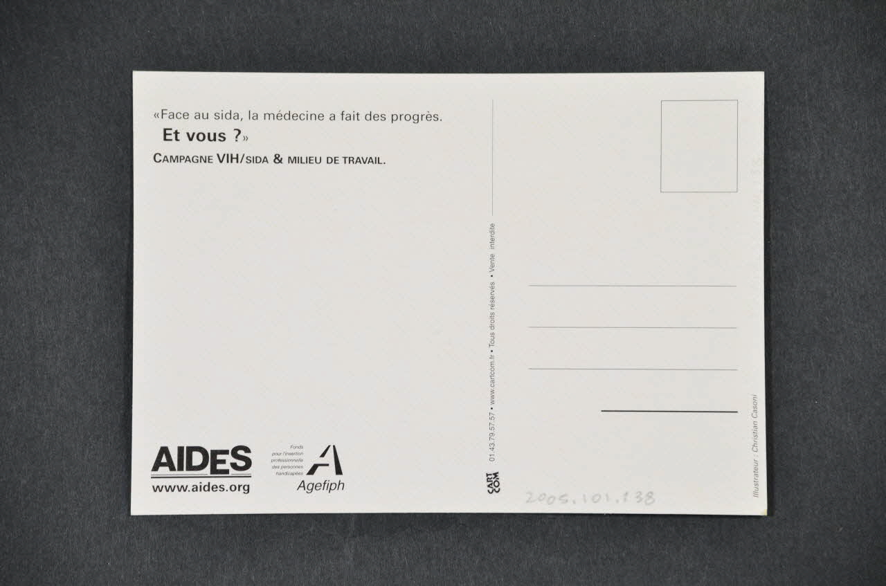 Sida Info Service // 0 800 840 800 (Imprimé en noir et vert dans l'angle inférieur droit et précédé d'un ruban rouge), rectoAgefiph // Fonds // pour l'insertion // professionnelle // des personnes // handicapées (Imprimé en noir sur blanc en bas à gauche), versoDécor