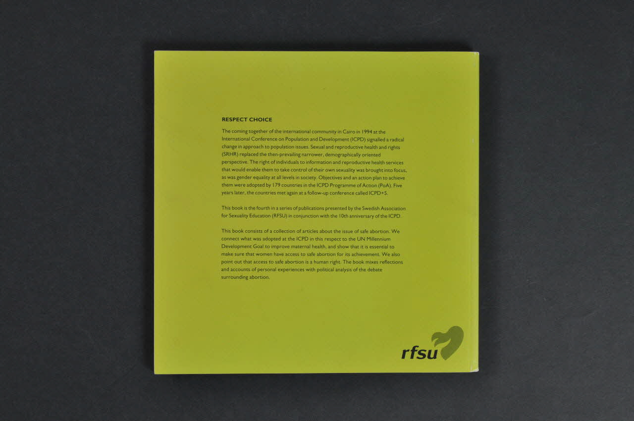 Couverture souple à fond vert encadrée par une bande verte en partie supérieure et orange en partie inférieure. Entre les deux, titre et sous-titre : "Respect choice - Safe Abortion a prerequisite for Safe Motherhood" (Respecter les choix. Avortement à moindre risque pour une maternité à moindre risque) , surplombant une double illustration stylisée. Tout en bas, en noir, mention de l'éditeur : "ICPD - The Foundation for the Millenium Development Goals".