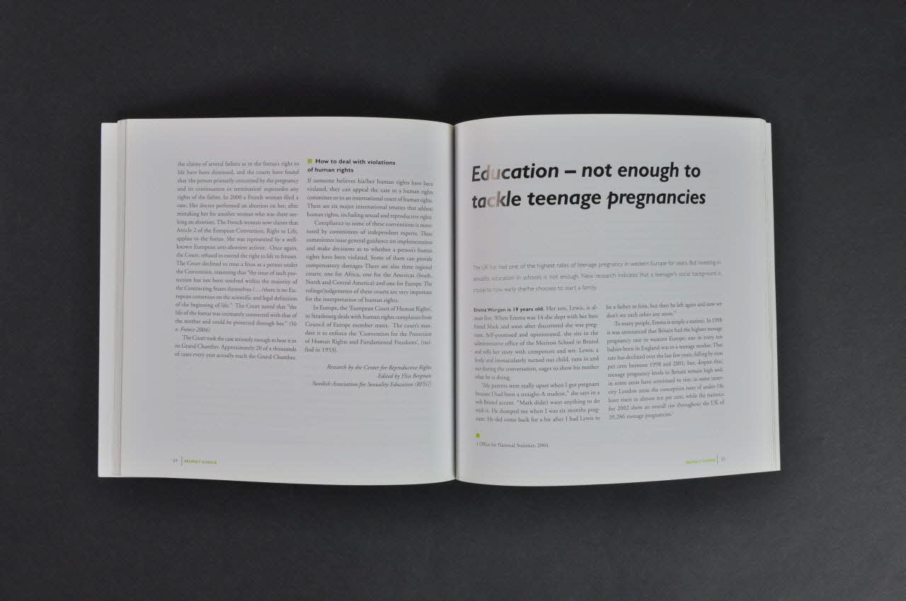 - p.4 Ann Svensen, directrive des relations externes de la RFSU : Il est temps de faire avancer l'agenda de l'avortement à moindre risque // - p.6 Les attitudes moralisantes font souffrir les femmes (au Kenya) // - p.14 Rashida Abdullah : le besoin de rompre le silence (sur les décès de femmes dus à des avortements à risque) // - p.16 Arguments politiques (C'est un droit humain / refuser aux femmes l'accès à l'avortement est une discrimination de genre / la vie et la santé des femmes sont menacées par l'avortement à risque / l'avortement à risque coûte très cher) // - p.22 Katarina Lindhal, secrétaire générale de la RFSU : la question sensible du droit des femmes au choix // - p.24 Qu'est-ce qu'un droit humain ? // - p.27 Après 10 ans - les promesses ont-elle été tenues // - p.36 Dr Sangeeta Kaul : l'avortement à risque malgré une loi libérale (barrières autres en Inde) (Urugay / Brésil / Afrique du Sud / Italie) // - p.38 Tout est possible : changer des lois sauvera des vies // - p.46 Sandra Kabir : l'enseignement de base n'est pas assez // - p.48 Une stratégie à double standard // - p.53 Est ce que le Pape étrangle l'Union Européenne // - p.54 L'éducation n'est pas assez pour réduire les grossesses adolescentes // - p.72 Cynthia Dailard et Susan Cohen : l'idéalisation de l'abstinence aux Etats Unis // - p.74 Le mouvement anti-choix aux Etats Unis // - p.79 La voix pour la liberté du choix en Suède // - p.84 Mythes courants sur l'avortement // - p.92 Anna Musonda Phiri : la loi qui avait l'intention de sauver des vies de femmes (Zambie) // - p.94 Le VIH rend les avortements à risque plus dangereux // - p.98 Mona Sahlin, Ministre suédois pour la démocratie, l'intégration et les questions d'égalité des genres : le droit de chaque femme de prendre des décisions sur son propre corps. // - p.100 L'avortement médical rencontre des résistances // - p.105 Faits cléDécor