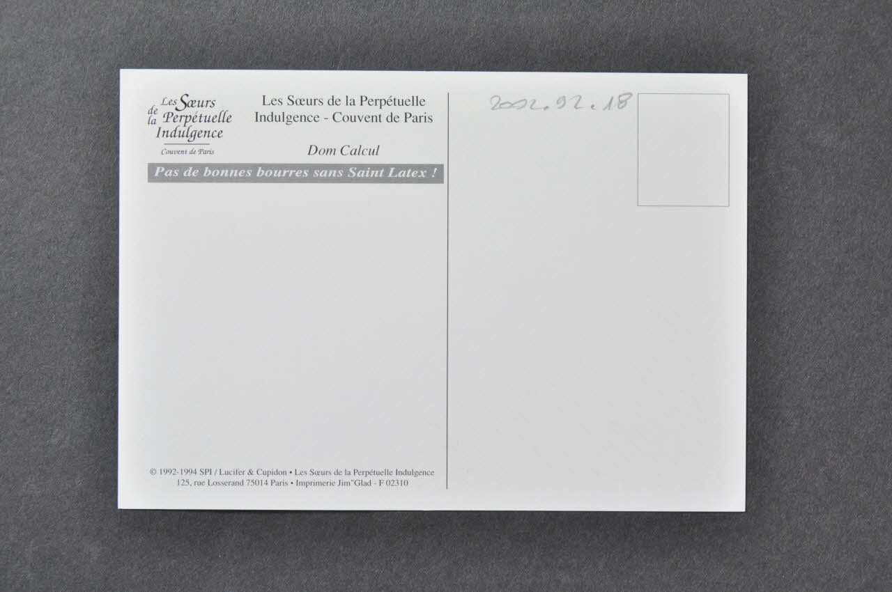 © 1992-1994 SPI/ Lucifer & Cupidon, "Les Soeurs de la Perpétuelle Indulgence. 125 rue Losserand 75014 Paris . Imprimerie Jim"Glad - F 02310 (en bas à gauche), versoSlogan