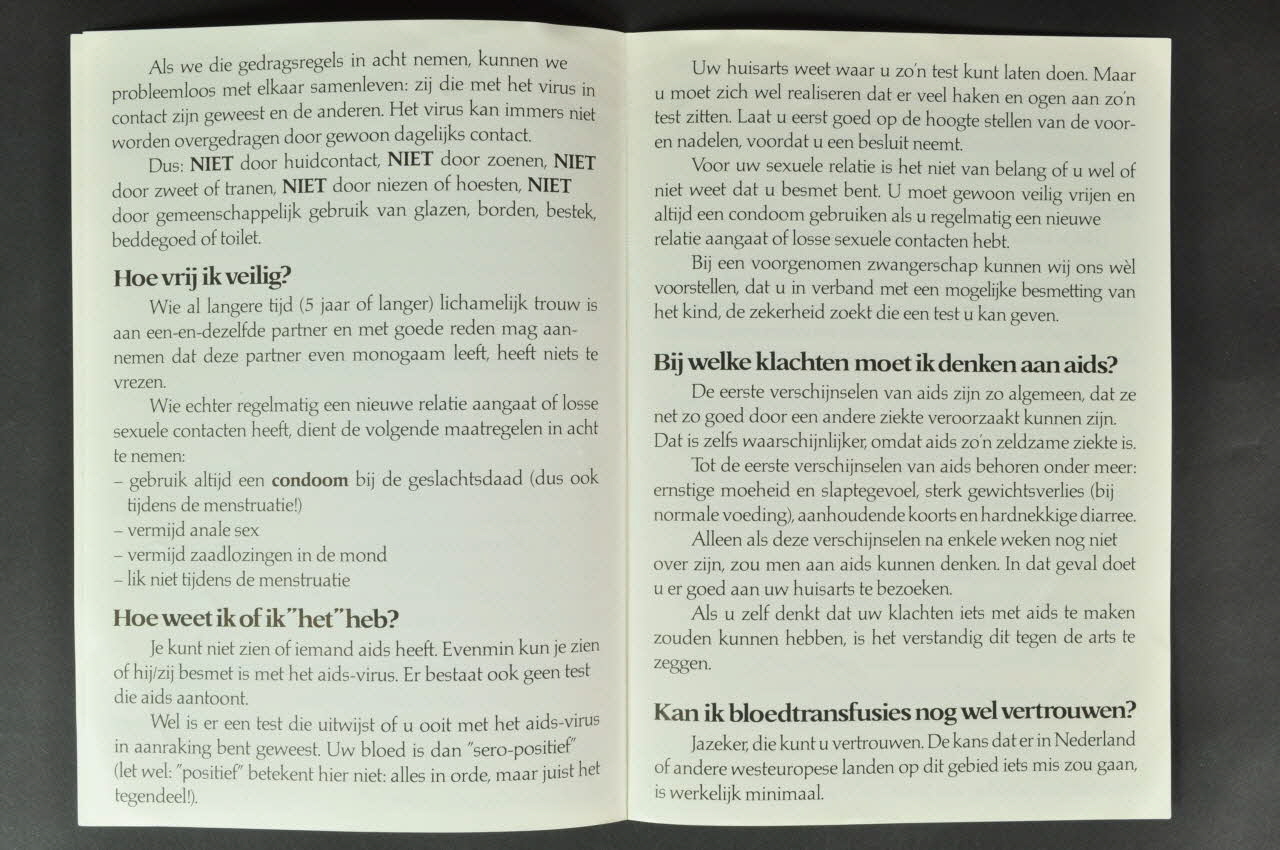 Sommaire (traduire les titres) // - Wat is aids ? // - Is aids een typische homo-ziekte ? // - Ga je er altijd dood aan ? // - Hoe wordt aids overgedragen ? // - Hoe wordt aids beslist niet overgedragen ? // - Hoe vrij ik veilig ? // - Hoe weet ik of ik "het" heb ? // - Bij welke klachten moet ik denken aan aids ? // - Kan ik bloedtransfusies nog wel vertrouwen ? // - Tot slot. (au fil des pages)Slogan