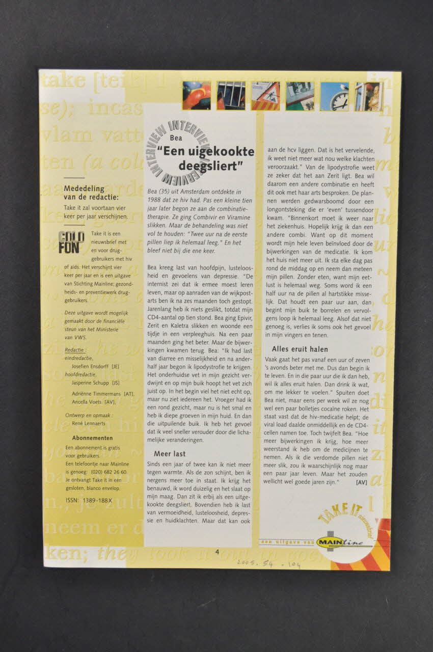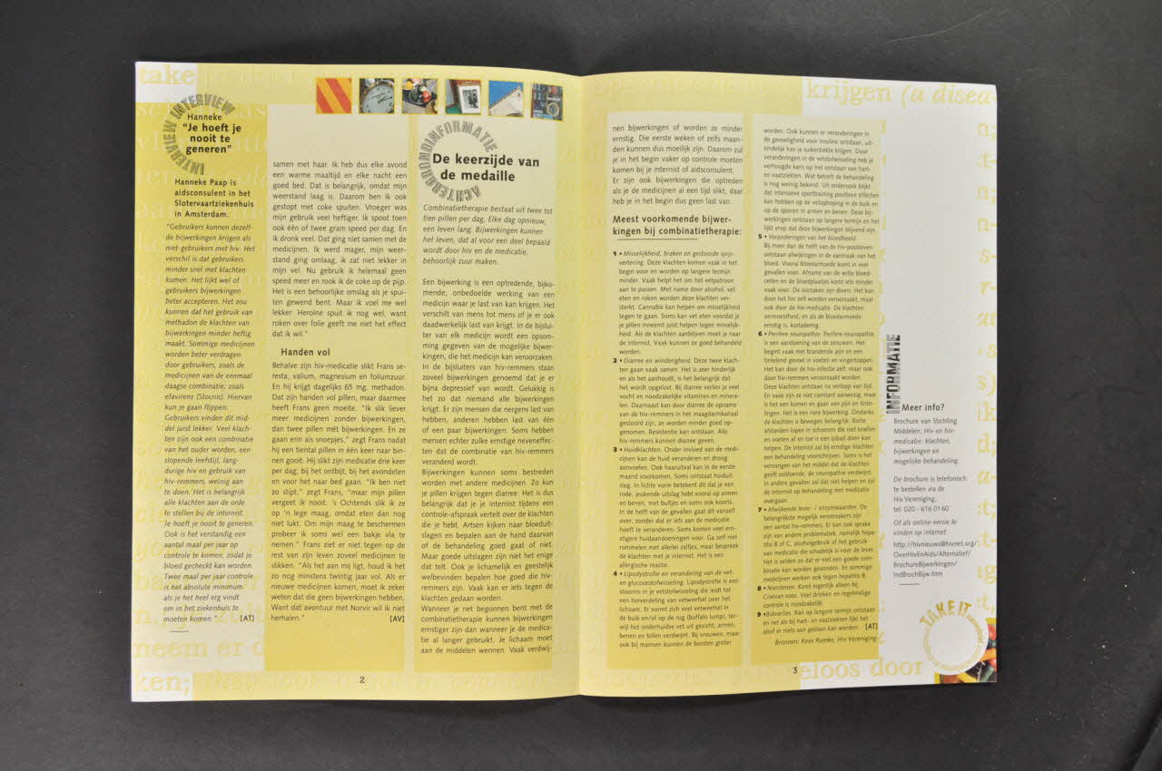 Sommaire en partie traduit et commenté : - p.1 Annonce du contenu du numéro : " Bijwerkkingen. Slikken of stikken ? (traduire) - p.1 Interview : Frans : "Ze gaan erin als snoepjes" - p.1 Information :"Wat te doen bij brakken - p.2 Interview : Hannekke :"Je hoeft je nooit te generen" - p.2 et 3 Information : De keerzijde van de medaille (L'autre côté de la médaille ??) Sur les effets secondaires des traitements - p.4 Interview : Bea : "Een uigekookte deegsliert"