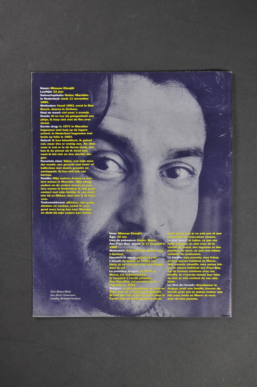 Au recto le fond est une photo colorée en orange. Elle représente un visage masculin. En haut, dans un ovale jaune cerclé de blanc et noir, est inscrit le nom de la revue en capitales puis italiques noires. En dessous figure un sous titre. Au milieu il y a quatre titres en capitales blanches, accompagnés de quatre sous titres en jaune. A l'intérieur, le fond est blanc, avec des textes en noir, accompagnés de nombreuses photos, en noir et blanc, représentant des personnes. La double page du milieu, est imprimée en couleur, avec un dépliant en papier cartonné détachable. Au verso, le fond est une photo colorée en violet. Elle représente un visage masculin. Dans la partie basse et à gauche, se trouvent des textes en petites lettres blanches et jaunes.Inscriptions