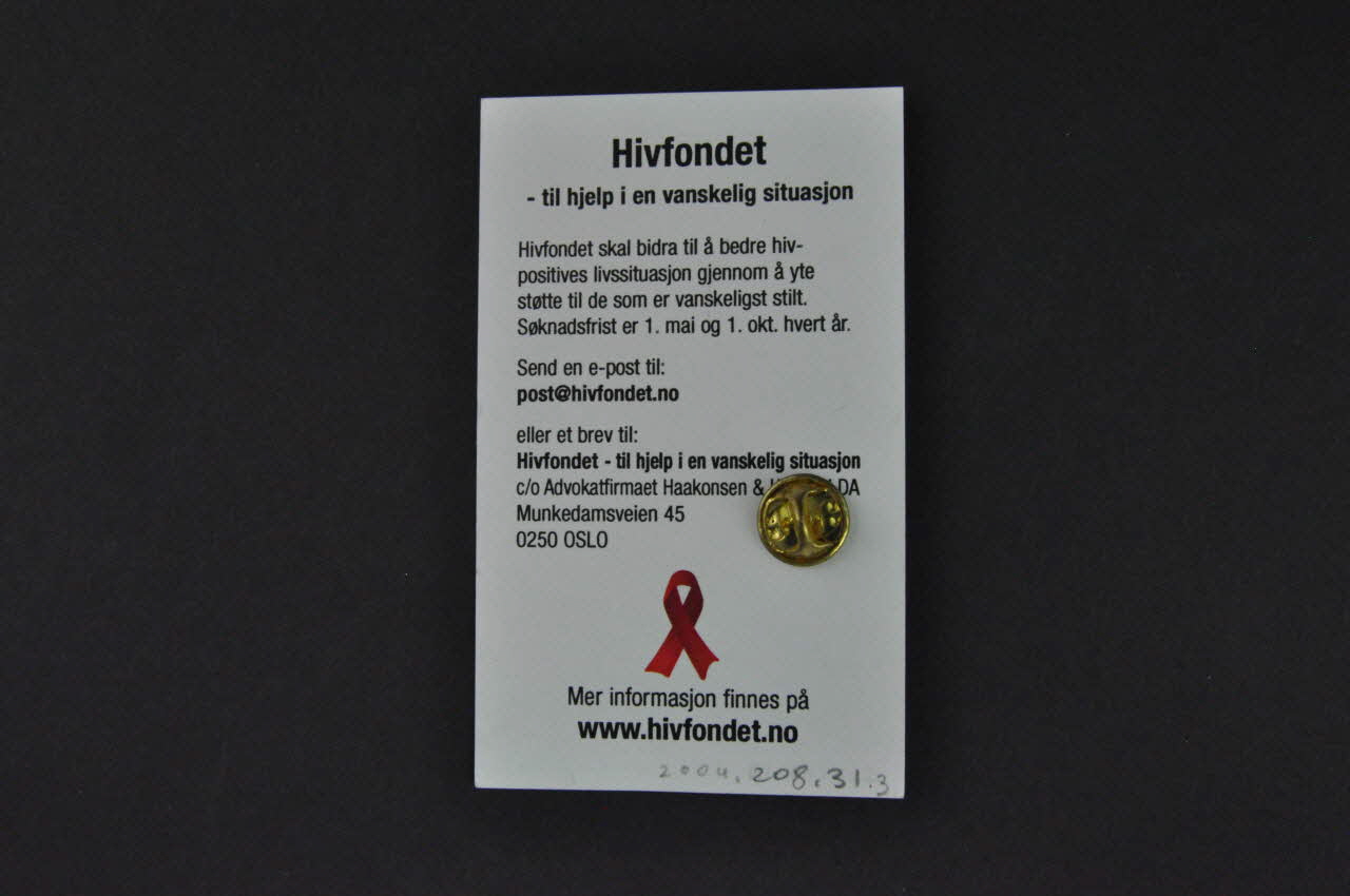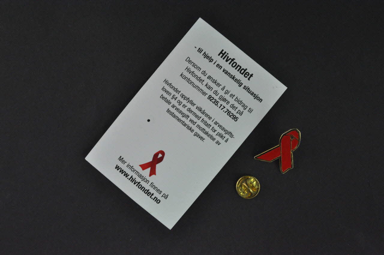 Métal moulé émaillé. / Pin's en métal doré émaillé, présentant un ruban rouge, fixé sur une petite carte rectangulaire en carton blanc, sur laquelle prennent place, sur les deux faces, de nombreuses inscriptions.Décor