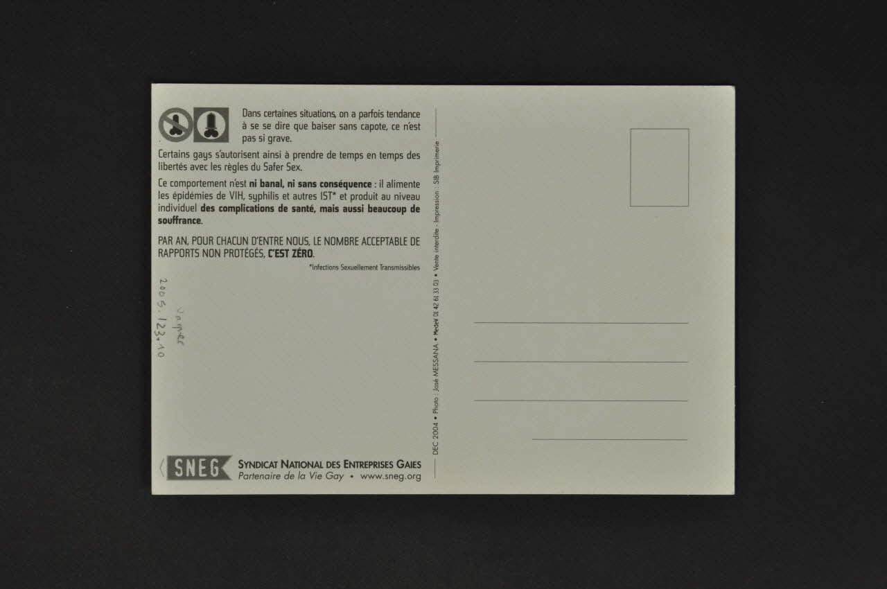 C'est une carte postale de forme rectangulaire. Sur le recto, on y voit une impression photo colorée sur fond noir: Deux hommes, presque nus, vêtus d'un slip blanc pour le premier, s'enlacent. Dans la partie inférieure et supérieure, à gauche, on y voit des inscriptions d'ordre préventives. En bas à gauche divers logos sont visibles.