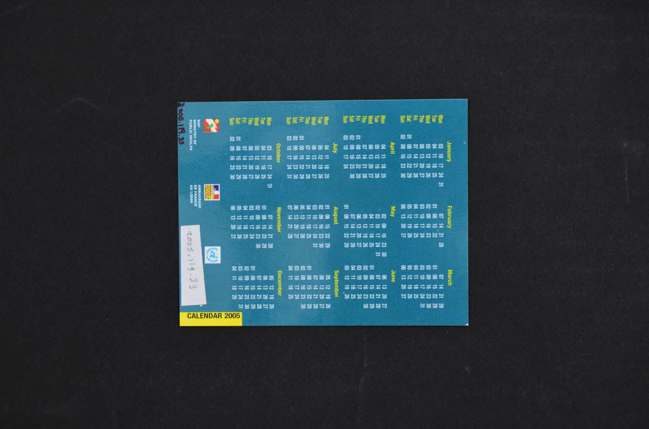 Au verso, le fond est bleu vert, avec un calendrier de douze mois inscrit au milieu. Il est sur quatre rangées de trois colonnes, avec les jours et les mois en jaune, les chiffres en blanc. Dans la partie basse, figurent trois logos, les uns à côté des autres.