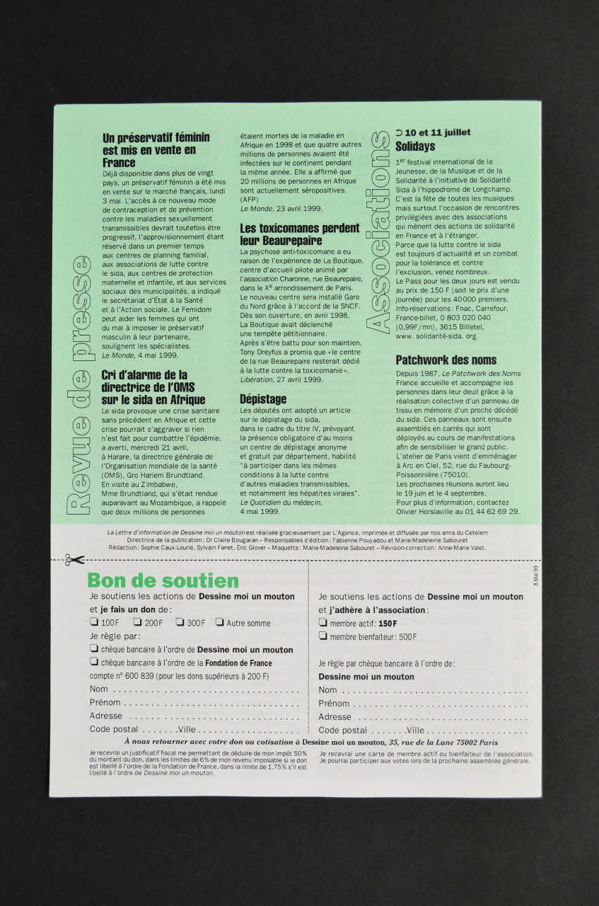 Dans un encadrement à fond vert, à gauche, on trouve un éditorial signé de la présidente. Il y a un texte à droite signé et illustré d'une photo. En bas il y a les coordonnées de l'association. Au dos il y a un appel aux dons sur fond blanc en bas. En haut il y a l'agenda de l'association sur un fond vert. A l'intérieur il y a plusieurs textes. Ceux sur le côté gauche sont sur un fond vert, les autres sur un fond blanc. Un mouton dessiné illustre un encart.Inscriptions