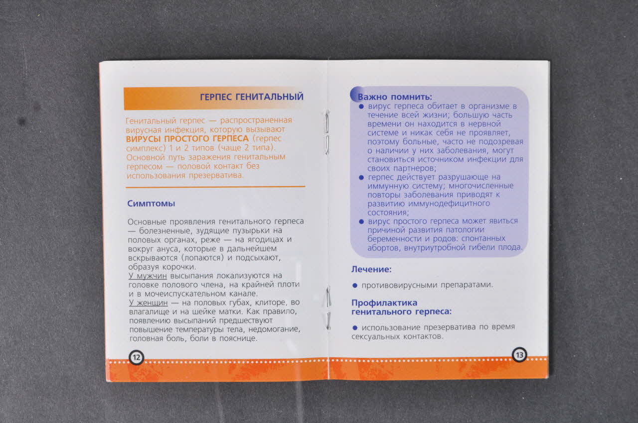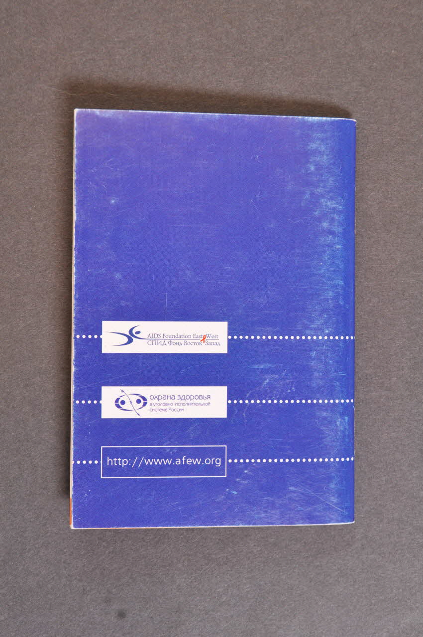 La couverture a un fond bleu, le titre se trouve en haut à droite, en caractères cyrilliques blancs. Il s'agit d'une brochure de prévention sur les Infections Sexuellement Transmissibles. Sur la gauche en dessous, verticalement on peut voir trois petites vignettes rondes en couleur, à l'intérieur il y a : un ruban rouge, deux silhouettes se tenant par la main devant la mer, des feuilles d'arbre. Verticalement entre les vignettes et horizontalement partent des lignes pointillées blanches qui en rejoignent d'autre au dos.