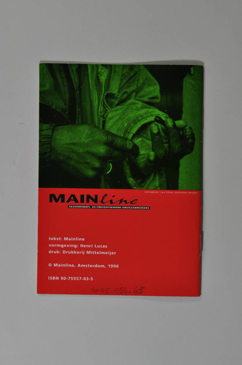 MAINline // GEZONDHEIDS- EN PREVENTIEWERK DRUGGEBRUIKERS (Imprimé en noir et blanc dans l'encadré rouge, sur deux lignes, la seconde étant imprimée en petits caractères), versoDécor