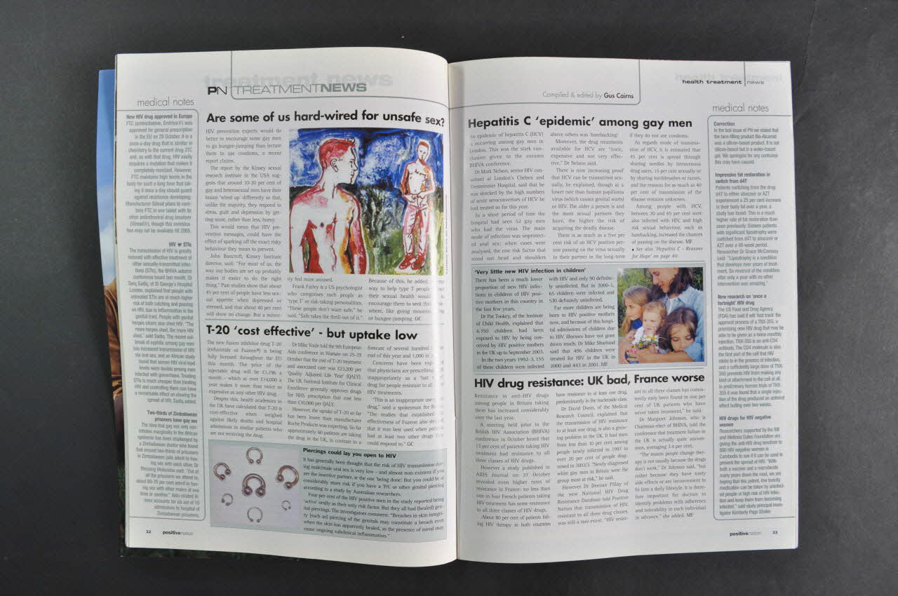 Exemplaire de la revue Positive Nation, revue de format A4 d'une soixantaine de pages de papier glacé, reliées par deux agrafes sous une couverture plus épaisse.