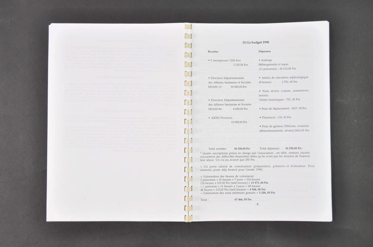 1. La présentation et le rappel du projet // 2. Les apports des connaissances et les animations proposées // 3. L'équipe d'encadrement // 4. Le groupe // 5. Les précisions sur l'évaluation // 6. Les participants inscrits // 7. L'apparent mieux être des participants // 8. Les situations professionnelles // 9. Les problèmes psychologiques // 10. L'inobservance des traitements // 11. Le budget 1998 // 12. L'évaluation de l'atelier de relaxation // 13. L'évaluation par l'infirmier encadrant // 14. L'évolution du projet // 15. Le lien entre le séjour et les autres activités de l'association // 16. La question de l'évaluation // 17. Les annexes : Documentation distribuée par la conseillère de santé (Imprimé en noir sur blanc dans la hauteur de la page 2), à l'intérieurDécor