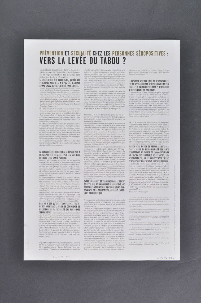 "CHACUN EST RESPONSABLE DE TOUS. CHACUN EST SEUL RESPONSABLE. CHACUN EST SEUL RESPONSABLE DE TOUS." ANTOINE DE SAINT-EXUPERY // IMAGE CRIPS 2004 / V. PERROTET / C. DEBRENNE (en bas), à l'intérieur"PRESQUE TOUJOURS, // LA RESPONSABILITE CONFERE // A L'HOMME // DE LA GRANDEUR." STEFAN ZWEIG (en petit, sur la droite), sur la couvertureLA PREVENTION DITE SECONDAIRE, AUPRES DES PERSONNES ATTEINTES, N'A PAS ETE RECONNUE COMME ENJEU DE PREVENTION A PART ENTIERE // // LA SEXUALITE DES PERSONNES SEROPOSITIVES A LONGTEMPS ETE NEGLIGEE PAR LES SCIENCES SOCIALES ET LA SANTE PUBLIQUE // // MAIS CE N'EST QU'AVEC L'ARRIVEE DES TRAITEMENTS QU'EMERGE LA PRISE DE CONSCIENCE DE L'EXISTENCE DE LA SEXUALITE DES PERSONNES SEROPOSITIVES // // ENTRE CULPABILITE ET TRANSGRESSION, LE STATUT DE CETTE IDEE SELON LAQUELLE IL APPARTIENT AUX PERSONNES ATTEINTES DE PROTEGER LEURS PARTENIARES, ET LA COLLECTIVITE, APPARAIT LARGEMENT PROBLEMATIQUE // // LA RICHESSE DE L'IDEE MEME DE RESPONSABILITE EST DILUEE DANS L'IDEE DE RESPONSABILITE PARTAGEE, ET IL FAUDRAIT PEUT-ETRE PLUTÔT PARLER DE RESPONSABILITE CONJOINTE // // PASSER DE LA NOTION DE RESPONSABILITE PARTAGEE A CELLE DE RESPONSABILITE CONJOINTE PERMETTRAIT DE PASSER DE L'ACCOUNTABILITY, OU CHACUN EST COMPTABLE DE SES ACTES, A LA RESPONSABILITE, OU LES COMPETENCES EN PREVENTION SONT PROPREMENT MISES EN COMMUN. (Seuls les titres sont transcrits), versoDécor