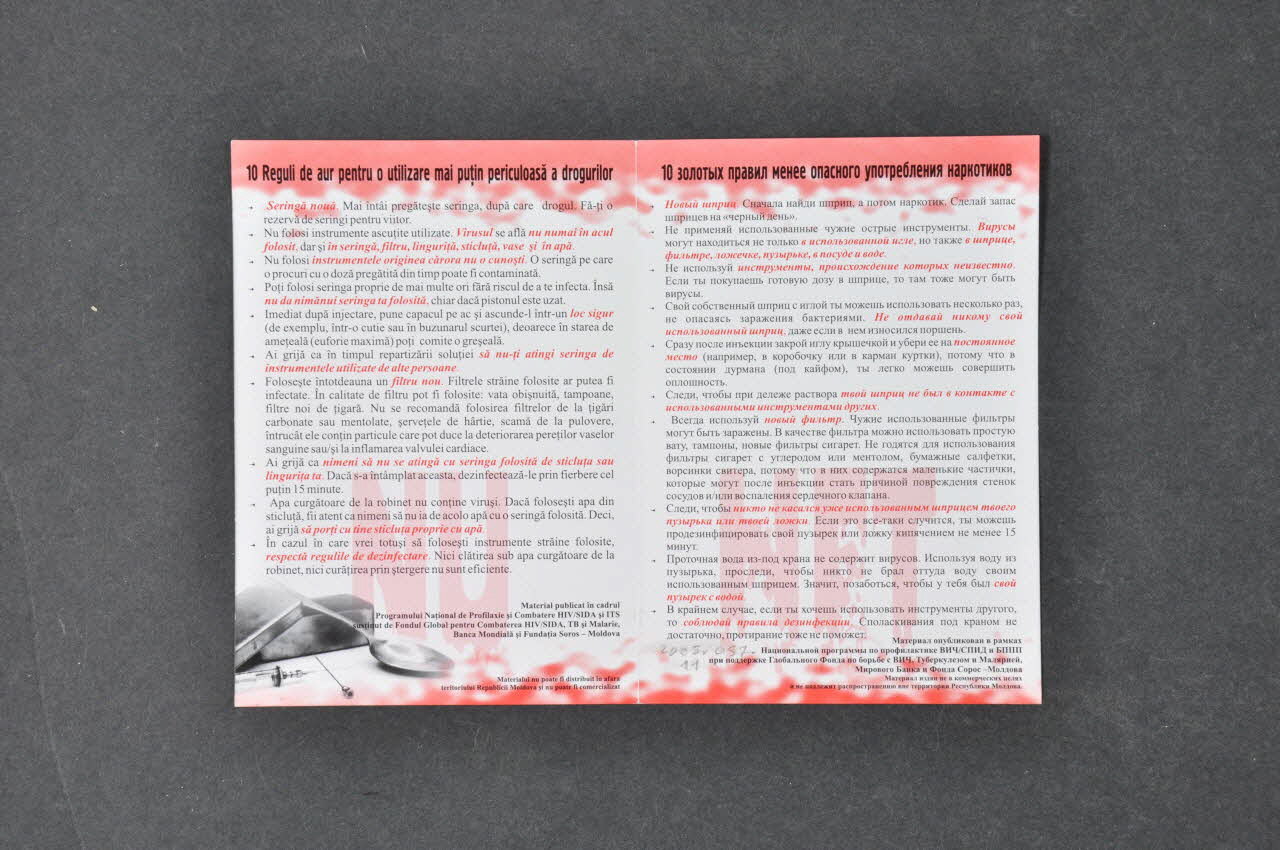En bas, un grand "NU" (non) en capitales rouges dont le bas ressemble à du sang. En bas, un grand "NIET" (non) en capitales cyrilliques rouges dont le bas ressemble à du sang. Texte en moldave à gauche et en russe à droite. En sous impression à gauche : "NU" et à droite : "NIET". 10 règles d'or de réduction des risques pour les usagers de drogues : seringues neuves chaque fois ou à la rigueur désinfectées.