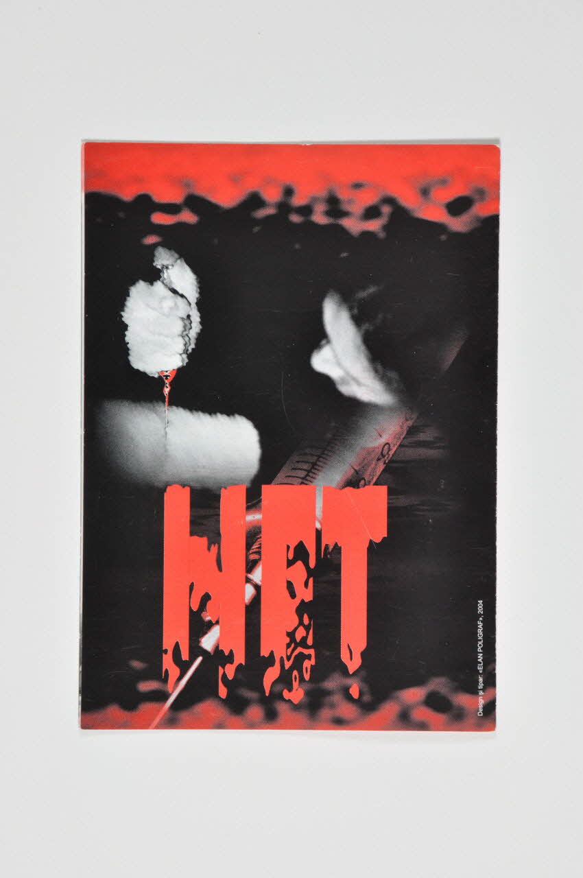 Le devant de la couverture est noir. Le haut et le bas sont rouges sous forme d'éclaboussures. Au centre, on distingue le visage d'une personne, une cigarette allumée dans la bouche et une seringue dans les mains. Dans le bas, on retrouve une inscription rouge, dont le bas des lettres se terminent comme des gouttes de sang. L'arrière de la couverture est de la même couleur, mais au centre, on distingue une personne en train de se piquer le bras à l'aide d'une seringue. Une autre inscription rouge est située dans la partie basse. L'intérieur du dépliant est composé d'inscriptions noires, dont les mots les plus importants sont en rouges. Dans le coin inférieur gauche, on remarque l'illustration d'une boite ouverte, d'une cuillère ainsi que d'une seringue et d'une aiguille. Les deux inscriptions rouges de la couverture sont réinscrites sur chaque page de l'intérieur du dépliant.Inscriptions