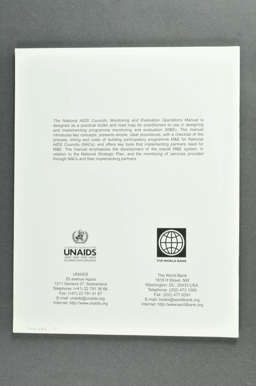 Au dos est imprimée une présentation du manuel et les logos de ONUSIDA et de la Banque Mondiale. Le Manuel est une "boite à outils" pratique et un plan destiné à des praticiens pour la mise au point de programmes de gestion et d'évaluation. Le manuel introduit des concepts clé : il présente des procédures simples, claires, avec une "check list" des processus, des calendriers et des coûts dans la production de programmes de participation aux Conseils Nationaux du Sida.Inscriptions