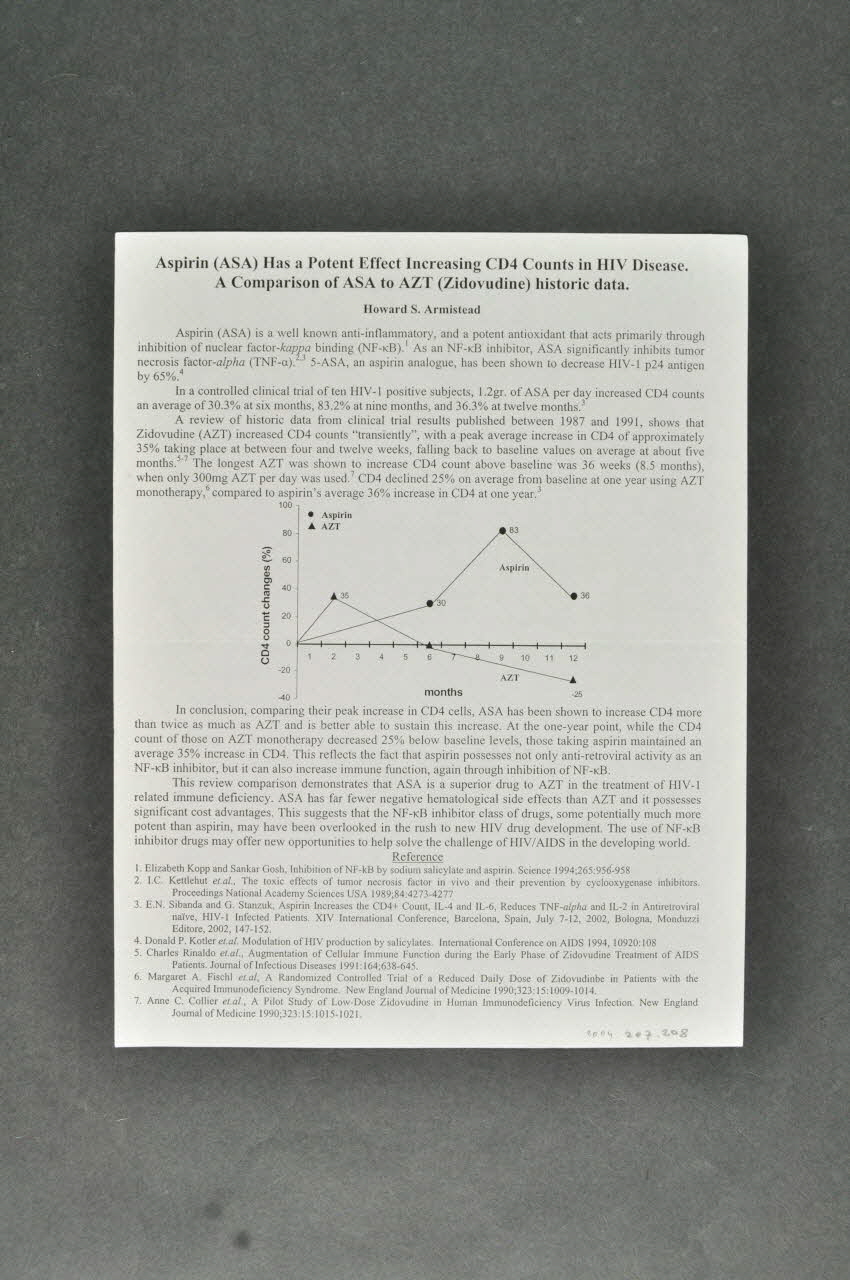 Aspirin (ASA) has a potent effect increasing CD4 Counts in HIV Disease. A comparison of ASA to AZT (Zkidovudine) historic data. // Howard S. Armistead (en haut), versoNom d'association, adresse