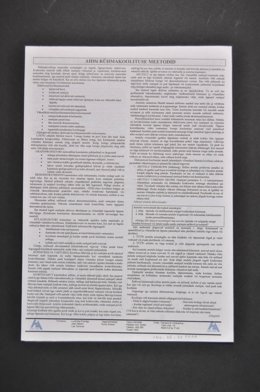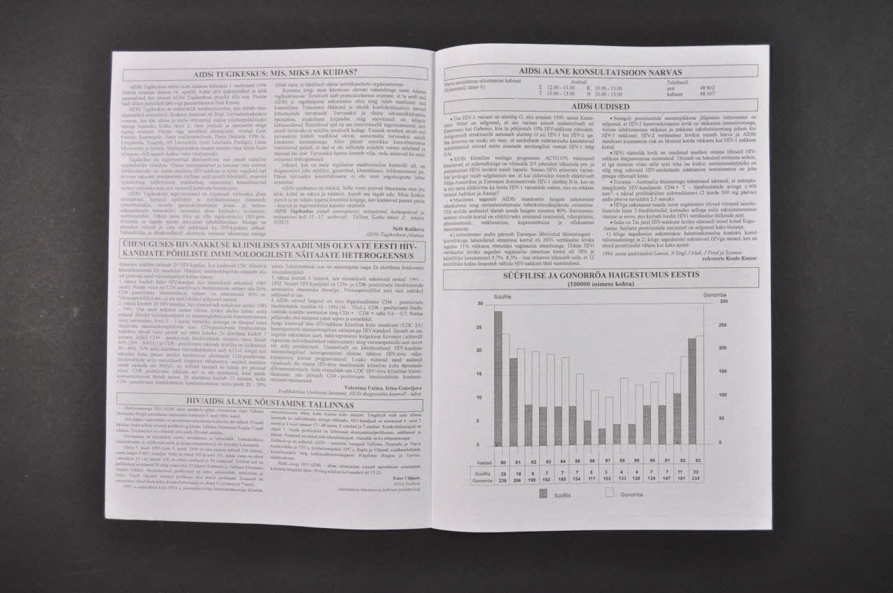 MEDITSIINILINE VALVUS HIV-NAKKUSE DIAGNOSTIKAS // HIV-NAKKUS EESTIS // HIVi LEVIKUTEEDE TÄHTSUS // AIDSi TUGIKESKUS: MIS, MIKS JA KUIDAS? // [...] // [...] (Noms des titres des différents paragraphes du bulletin), à l'intérieurANTI-AIDSi UUDISED (En haut de la première page inscrit en bleu), rectoNom d'association