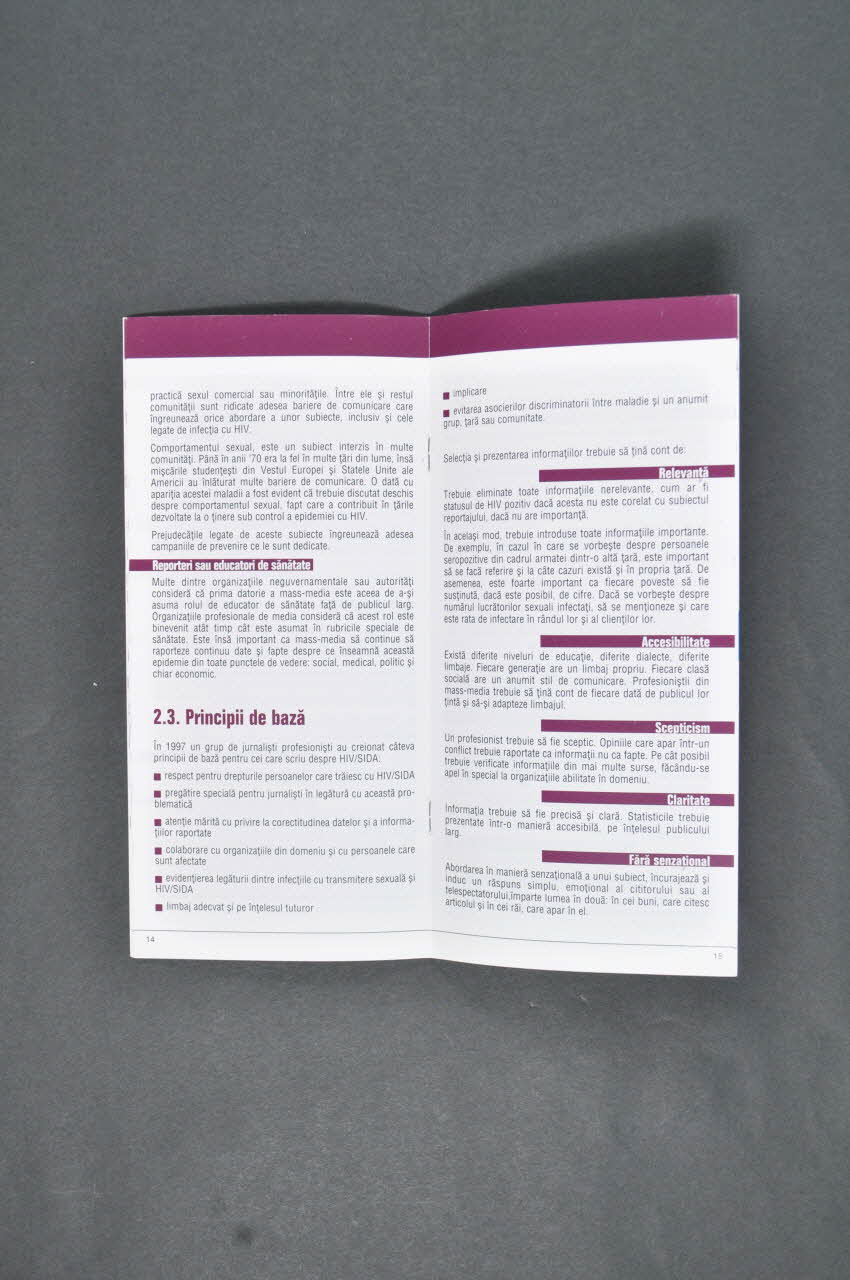 Réalisé en papier imprimé et relié, la brochure est de forme rectangulaire et porte des inscriptions en Roumain.
