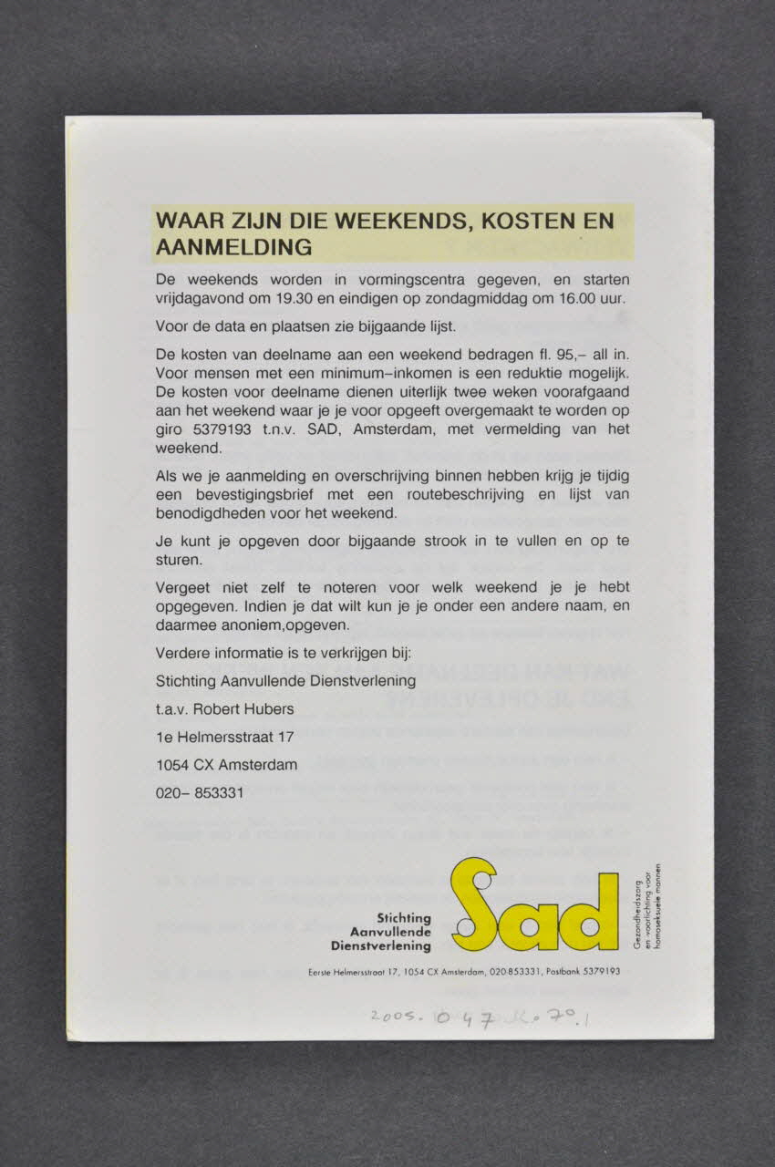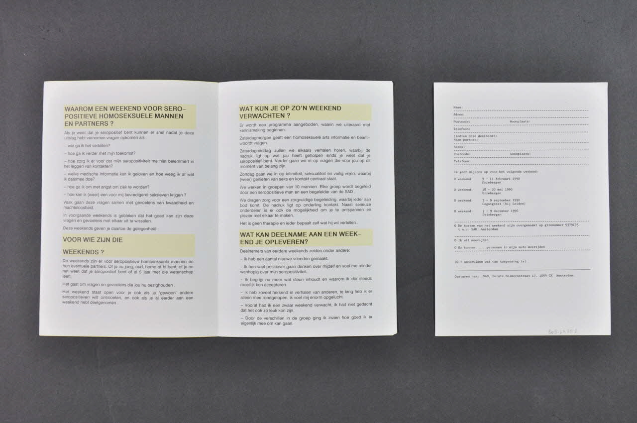 Dépliant, "Weekends voor seropositieve homoseksuele mannen" (Week end pour les hommes homosexuels séropositifs)