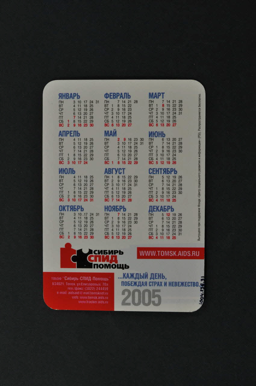 www.tracker.aids.ru (angle inférieur gauche, sur un cadre rouge.), versoWWW.TOMSK.AIDS.RU (vers l'angle inférieur droit, sur un bandeau rouge), versoDécor
