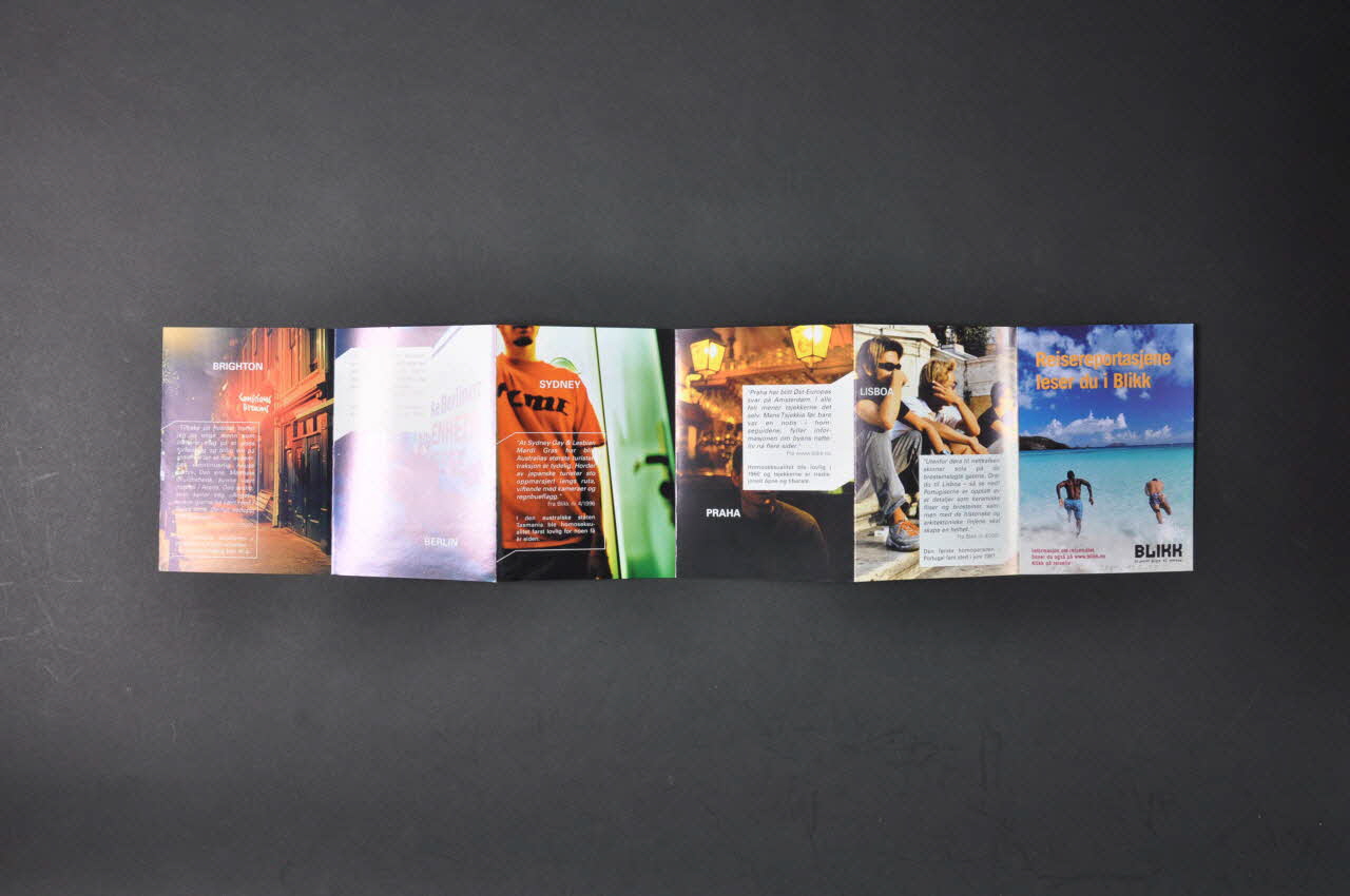 Dépliant de format rectangulaire en papier glacé imprimé en couleur. Il est en norvégien et comprend six volets.