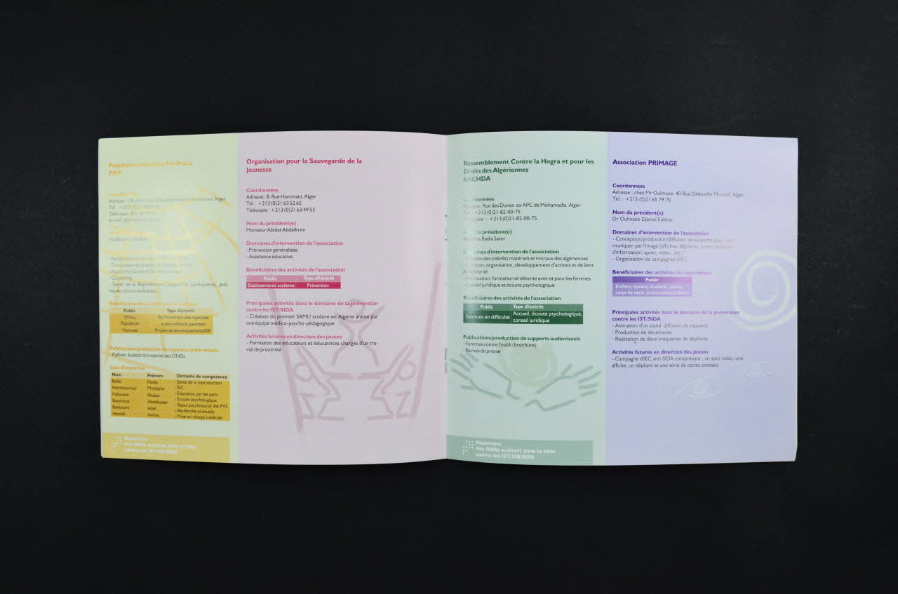 - Santé Sidi El Houari // - Espoir // - Association Algérienne pour la Planification Familiale (AAPF) // - AIDS Algérie // - Association Femmes Algériennes pour le Développement (AFAD) // - Scouts musulmans algériens (SMA) // - Association de Promotion des Jeunes // - Association Algérienne d'Alphabétisation (IQRAA) // - Association Etoile Culturelle d'Akbou // - Population Initiative For Peace (PIFP) // - Organisation pour la Sauvegarde de la Jeunesse // - Rassemblement contre la Hogra et pour les Droits des Algériennes (RACHDA) // - Association Primage // - Association de Protection Contre le Sida Hak le Wikaya (APCS) // - Association Nationale Femmes en Communication // - Fondation Nationale pour la Promotion de la Santé et le Développement de la Recherche (FOREM) // - Service Caritas d'Algérie // - Association El Hayet // - Alger Medical Club // - Association Régionale des Gynécologues Obstétriciens Privés du Centre // - Club Scientifique de la Faculté de Médecine d'Alger - Souk // - Association Droits de l'enfant - Biskra // - Association Prévention // - Association Solidarité AIDS, à l'intérieurLogo