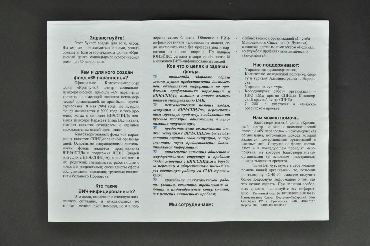 Il contient des textes en cyrilliques imprimés en noir. Ils sont illustrés d'un planisphère sur la couverture, avec un ruban rouge, et d'un ruban rouge sur fond de ciel bleu sur le troisième volet.Décor