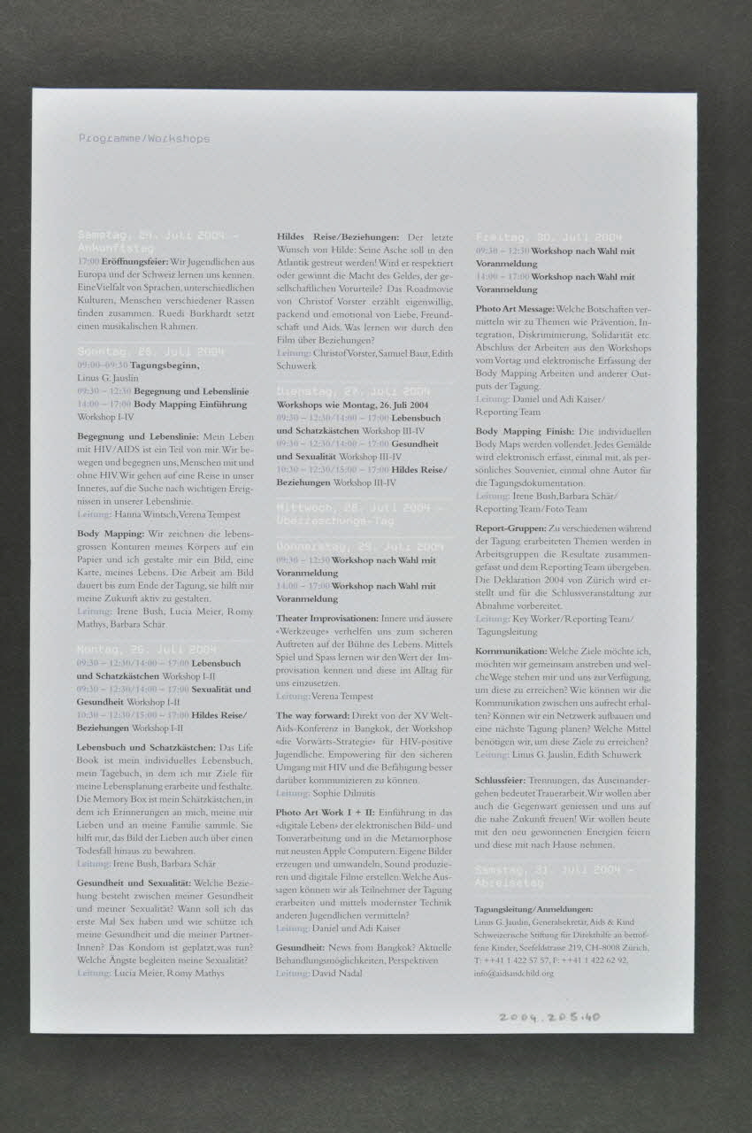 De format rectangulaire, la brochure présente une couverture avec une photoen sous impression en bleu de jeunes gens formant une file avec les bras en l'air.