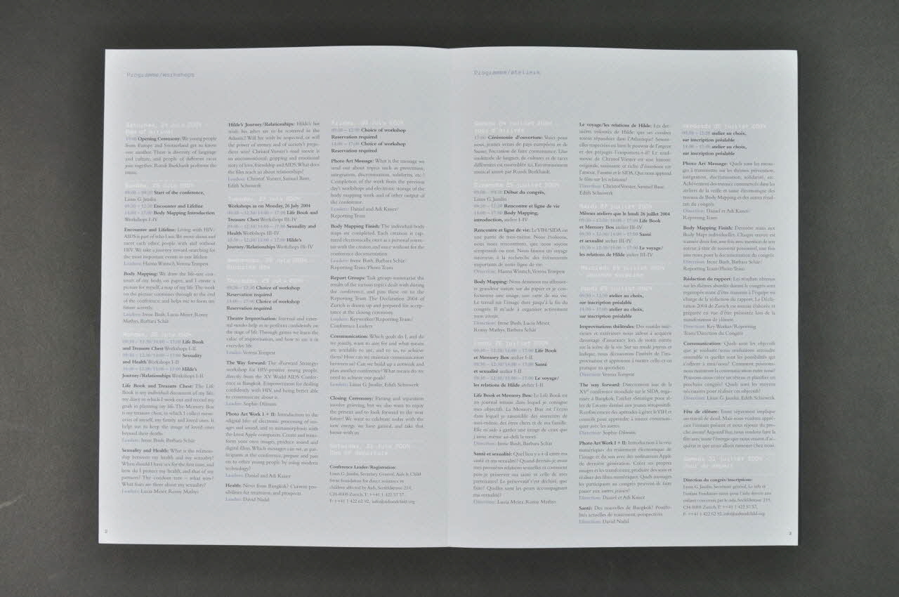 La double page intérieure et la page du verso présentent une liste d'activités en noir avec les dates en blanc et les horaires en bleu.
