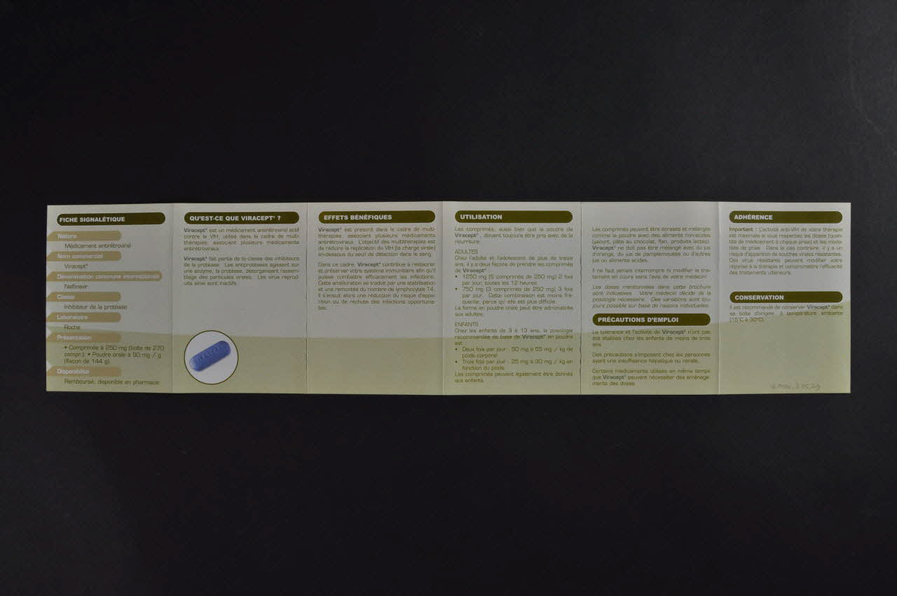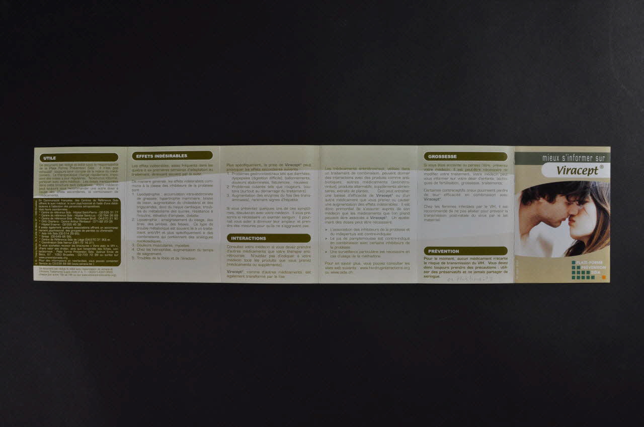 Mieux s'informer sur Viracept (Titre du dépliant imprimé sur la couverture.)Fiche signalétique // Qu'est-ce que Viracept ? // Effets bénéfiques // Utilisation // Précautions d'emploi // Adhérence // Conservation // Effets indésirables // Interactions médicamenteuses // Grossesse // Prévention // Utile (Titres des rubriques présentes dans le dépliant.)PLATE-FORME / PREVENTION / SIDA (Nom de l'association imprimé en bas à droite de la couverture.)Décor