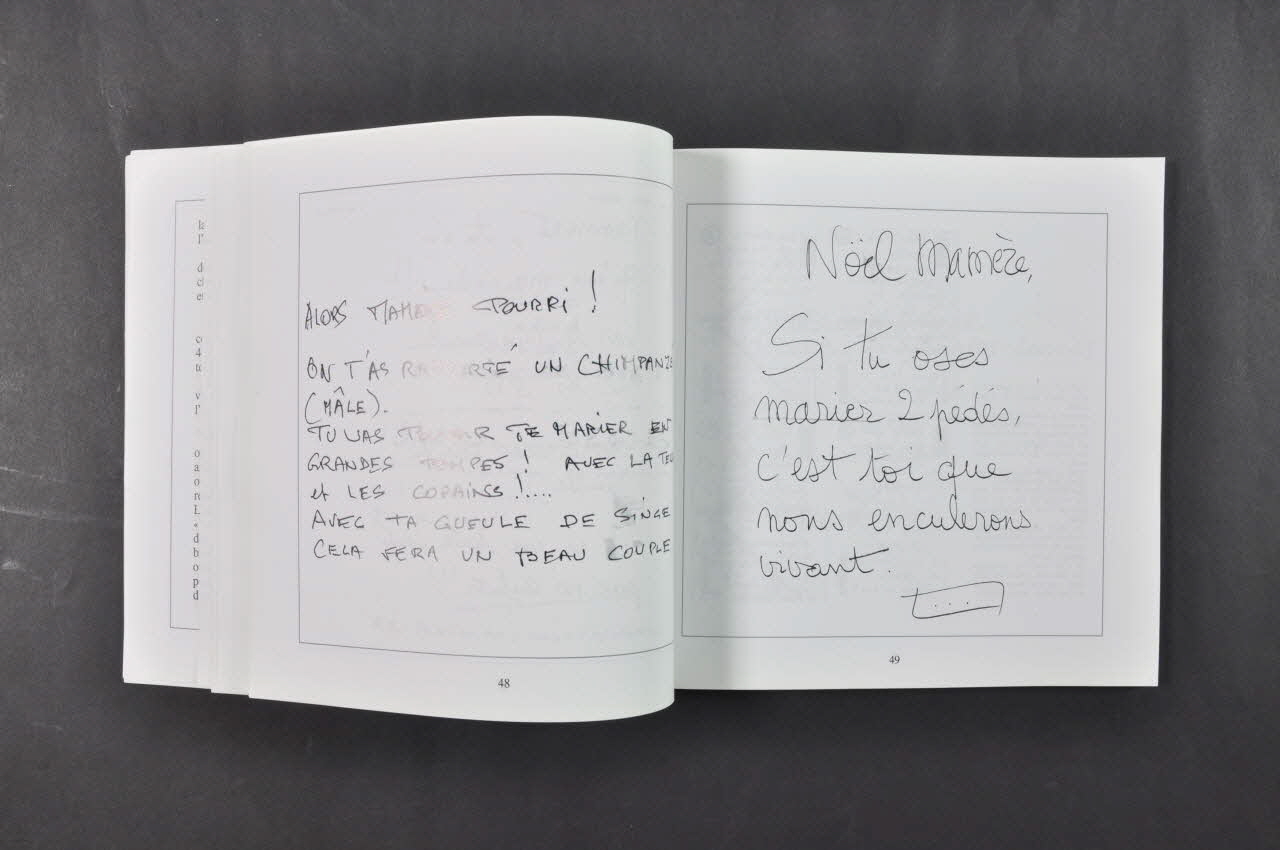Au dos, à droite, est imprimée une photographie et présentation de l'auteur : médecin, ancien international de Rugby, créateur du Centre d'Accompagnement et de prévention pour les sportifs et du syndicat des joueurs de Rugby professionnels, consultant au service des sports de France télévision. A gauche, une présentation du livre. Le livre reproduit des lettres reçues par Noël Mamère, en 2004, suite à la célébration du mariage homosexuel à Bègles. En prologue, on trouve une longue lettre de soutien écrite par un homme de 70 ans. A la fin, une carte postale de soutien :"Vous êtes l'honneur des hommes politiques français". Les lettres, dessins, graffitis sont pour la plupart extrêmement violents, avec des injures (enculé, PD), des menaces de mort, des termes ou objets scatologiques (papier WC, papier souillé), des allusions à la zoophilie, à la déviance, déchéance et perversion, insulte à la loi divine, acte contre nature Quelques références au sida : p.38 "C'est les homosexuels qui nous emmènent le S.I.D.A. Tremper sa bite dans la merde, on attrape des virus et autres saletés que l'on transmet aux autres" /p.45 "Lorsque tous les servives de gastro-recto-entérologie de tous les hôpitaux de France et de Navarre seront pleins à craquer de tous tes copains "gays" atteints du SIDA, gloire au novateur !" / p.63 "Es-tu PD. Elle est belle la mairie. J'espère que tu auras le Sida"/ p.64 "Faites attention à votre pédophile de maire, c'est eux qui donnent le sida, c'est la seule donation de ce PD et des socialistes" / p.78 "Célébrer le mariage de deux pédésn ça c'est fort dans un monde où l'on combat le sida, encourager les vecteurs, c'est très fort ! Quand les gens normaux pourront ils se retourner contre ces pédérastes qui propagent le sida en toute impunité et qui coûtent très cher à la Sécu et à la nation." / p.94 "Afin d'éliminer le SIDA, faisons en premier la chasse aux HOMOS masculins et féminins.... Ne nous étonnons pas si le SIDA progresse." / p.101 "Le sida est leur punition. Ils l'ont cherchée" / p.127 "Monsieur, d'où vient le sida des homosexuels ? Et si Dieu a créé l'homme et la femme, ce n'est sûrement pas pour rien."Inscriptions