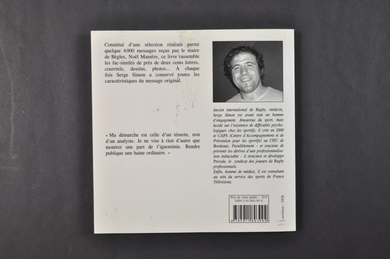 SERGE SIMON / HOMOPHOBIE / 2004 FANCE (sur la couverture)Constitué d'une sélection réalisée parmi quelque 4.000 messages reçus par le maire de Bègles, Noël Mamère, ce livre rassemble les fac-similés de près de deux cents lettres, courriels, dessins , photos... A chaque fois Serge Simon a conservé toutes les caractéristiques du message original. (Présentation du livre, au dos.)Décor