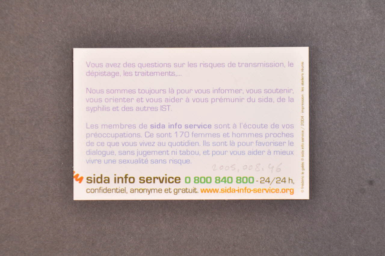 sida info service 0800 840 800 - 24/24h // confidentiel, anonyme et gratuit. www.sida-info-service.org (en bas), versoDécor