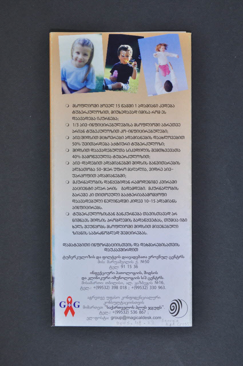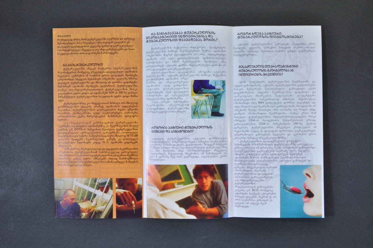 Dépliant : "Informations générales sur la tuberculose et le sida" / Feuillet 1 Fond brun avec en sous impression pâle image anatomique de poumons, impression en noir. En bas, deux vignettes, détenu recevant une piqure, jeune homme tenant une seringue Feuillets 2 et 3 Fond jaune pâle avec en sous impression pâle image anatomique de poumons, impression en noir. Trois vignettes : homme assis, jeune homme consultant, bouche recevant une pilule Feuillet 4. Fond brun rose, impression en noir. Deux vignettes : médecin consultant, groupe de jeunes souriants. / "Informations générales sur la tuberculose et le sida" Dos. Fond brun clair. Inscription en caractères noirs. En bas logo et coordonnées de Georgia Red Cross.