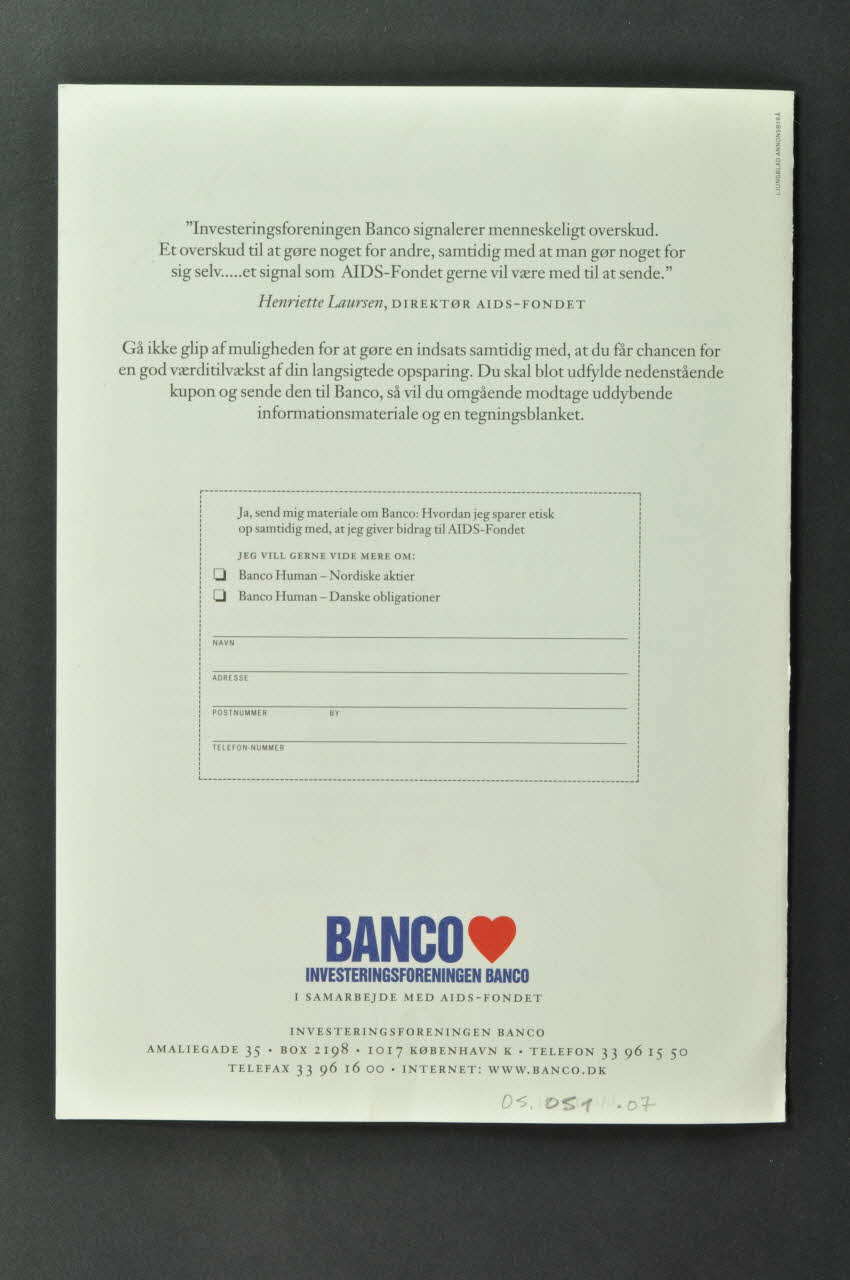 BANCO // INVESTERINGFORENINGEN BANCO // I SAMARBEJDE MED AIDS-FONDET // // INVESTERINGSFORENINGEN BANCO // AMALIEGADE 35 . BOX 2198 . 1017 KØBENHAVN K . TELEFON 33 96 15 50 // TELEFAX 33 96 16 00 . INTERNET : WWW.BANCO.DK, versoDécor