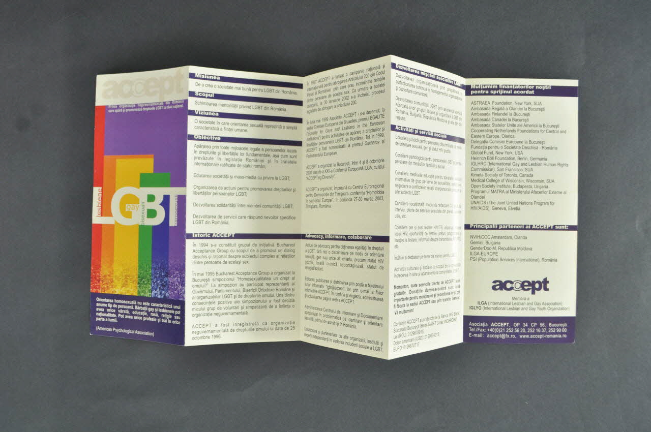 Mission // Goal // Vision // Objective // Background of ACCEPT // Advocacy, information, collaboration // Enhacing the LGBT association movement // Social activities and services // We thank ourv donors for their support // ACCET's main partners (les pages intérieures au recto // verso en Roumain)Décor