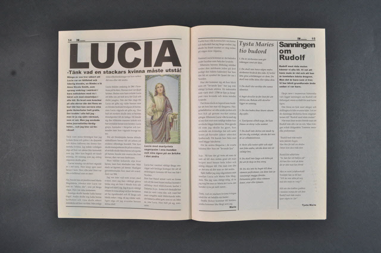 La revue suedoise est imprimée sur du papier journal, en couleur et en noir et blanc. Elle a 23 pages reliées entre elles par deux agrafes.