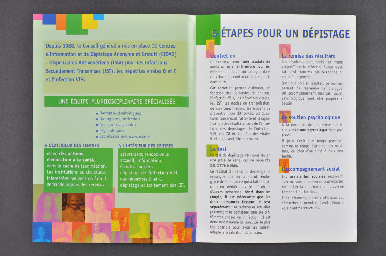 Volet 1 Fond vert clair. Impression en bleu et en blanc. Présentation des centres : "Une équipe pluridisciplinaire spécialisée" / A l'extérieur des centres : actions d'éducation à la santé / A l'intérieur des centres. En bas, montage de 12 photos de soignants colorées en violet, bleu, rose, brun, vert. Volet 2 Fond blanc, impression en violet . Titres des paragraphes précédés par une toute petite photo de soignant. "5 étapes pour un dépistage" : L'entretien / Le test / La remise des résultats / Le soutien psychologique / L'accompagnement social.