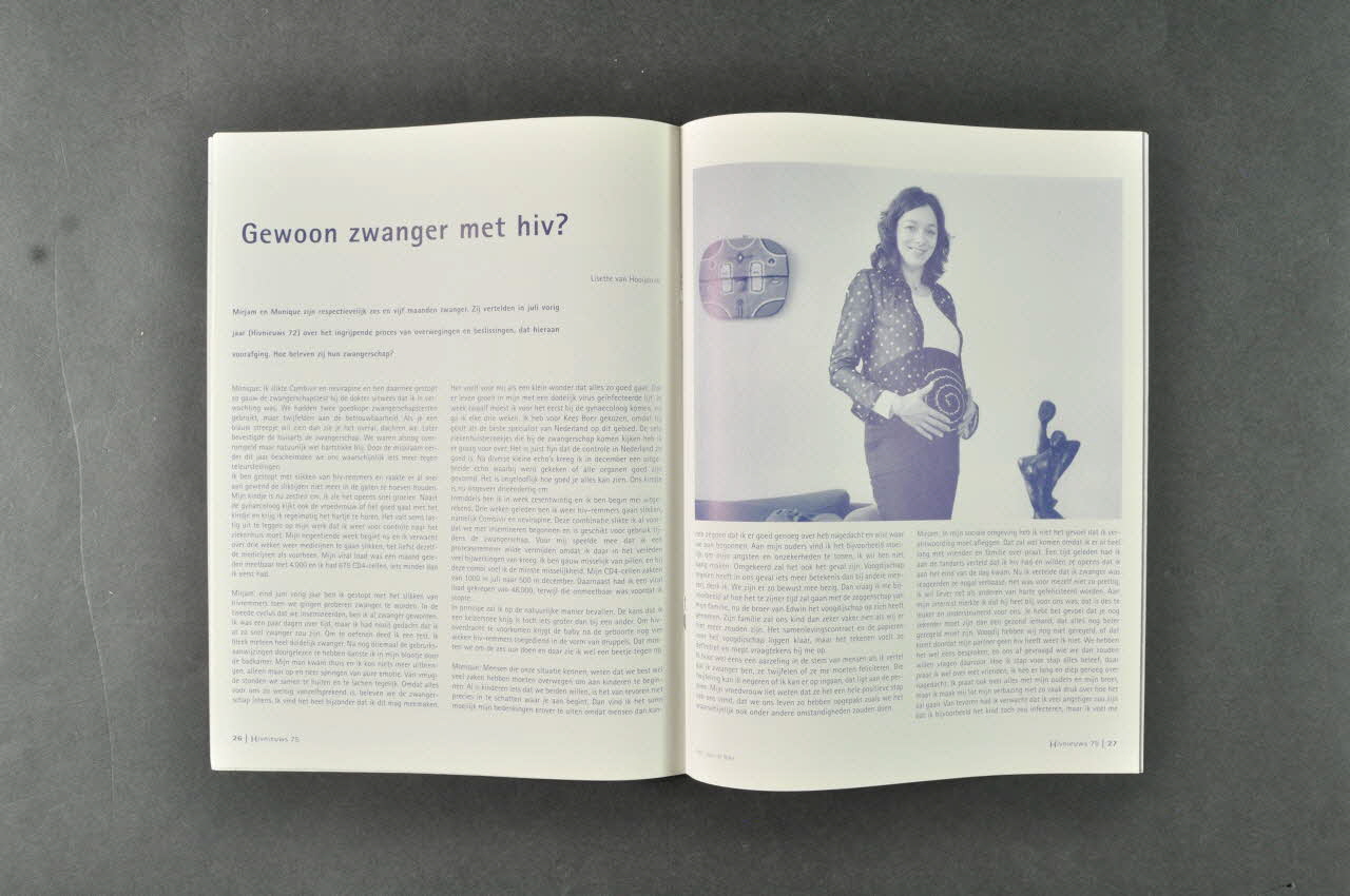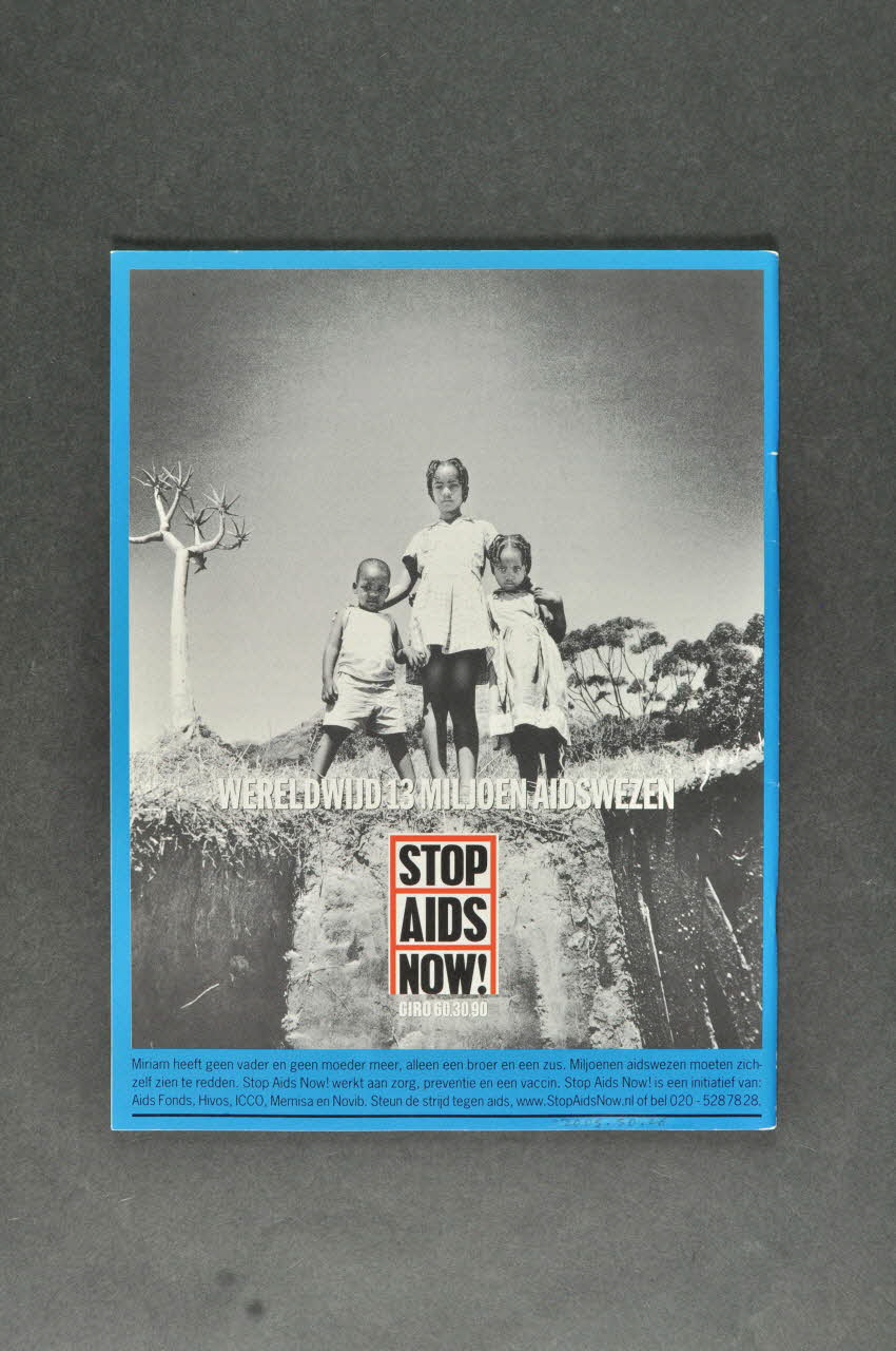 Sur la couverture on peut voir au centre une photographie de trois personnes se baignant. La photo est coupée par le titre à la une en orange sur fond bleu. En haut on peut lire le numéro de la revue, son titre et dessous dans un bandeau blanc la date et le prix. Au dos il y a la reproduction de l'affiche 2005.047.274. L'affiche est composée autour de la photo noir et blanc de trois enfants noirs dans un paysage désertique d'Afrique : une petite fille plus grande tient par le cou un garçonnet et une fillette. En dessous, il y a le logo de la campagne, en noir sur fond blanc, encadré de rouge. En bas, on trouve en neerlandais une explication de la situation des enfants : ils sont orphelins à cause du sida ; puis un appel de fonds dans le cadre de la campagne. A l'intérieur les pages sont imprimées en bleu foncé sur fond blanc. Le texte est imprimé sur deux colonnes avec les titres en gras parfois illustré de photographies en noir et blanc bleuté ou de dessins.Inscriptions