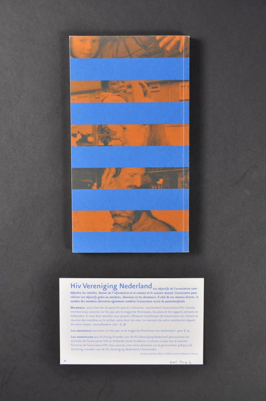 HIV Vereniging Nederland // Antwoordnummer 47345 // 1070 VC Amsterdam // servicepunt@hivnet.org (.2, verso), sur la couvertureHIV Vereniging Nederland // eerste Helmersstraat 17 // 1054 CX Amsterdam // Postbus 15847 // 1001 Amsterdam // info@HIVnet.org // www.HIVnet.org // www.jongpositief.nl (.1, troisième de couverture), sur la couvertureLégende