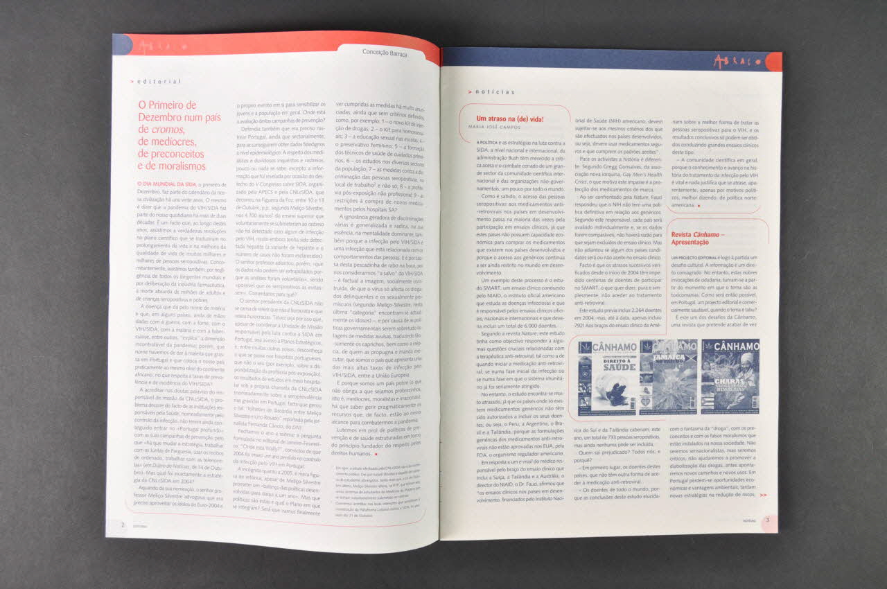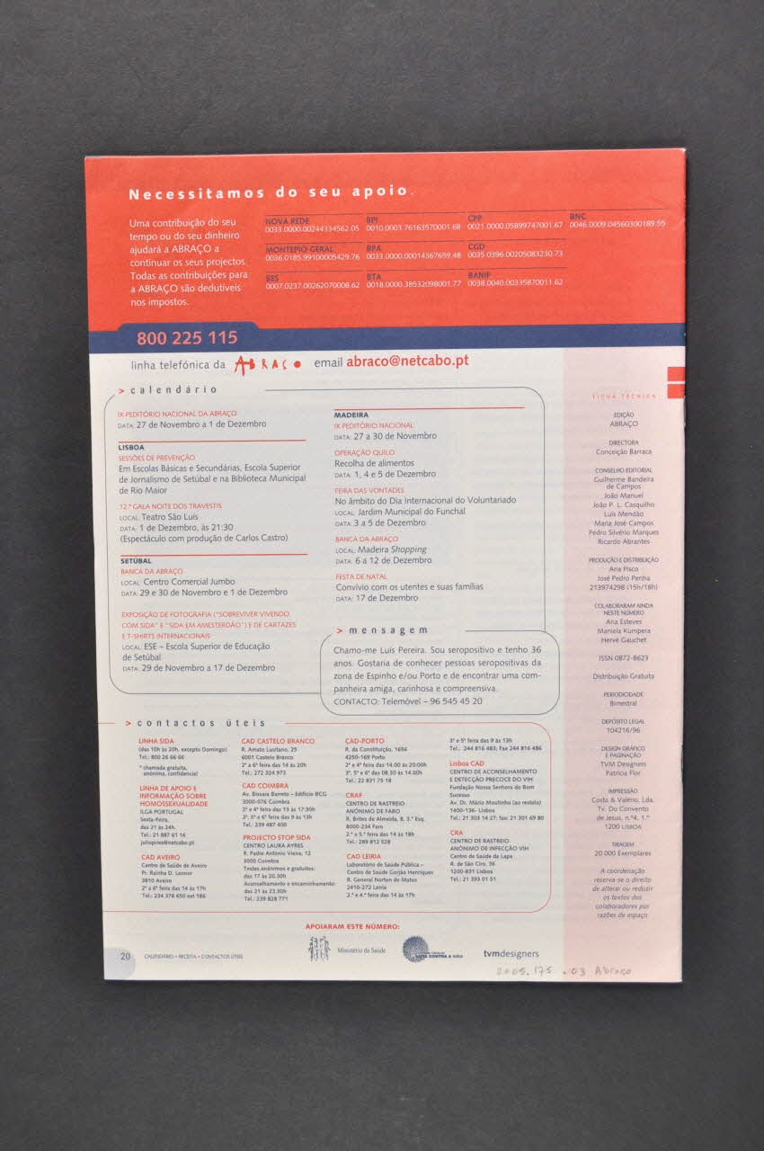 Sommaire en partie commenté : p.2 Editorial : Le premier décembre. Vives critiques de la politique sanitaire relative au sida au Portugal et du VNLcSIDA. p.3-4 Nouvelles - p.4 Lettre ouverte du GAT (Groupe portugais d'activistes sur les traitements du VIH/sida)à l'Association portugaise pour l'étude clinique du sida (APECS) et à la Commission nationale de lutte contre le sida (CNLCS) (refus d'inviter le GAT au 5ème congrès national sur le sida) p.5-6 Infections - Traitements - p.5 Nouveau médicament contre l'hépatite B au Portugal p.7-10 Prévention - p.7 Charge virale plus élevée dans les sécrétions rectales que dans le sang et le sperme pour les hommes qui ont des relations sexuelles avec des hommes - p.8 Zurich vote pour les traitements par héroïne p. 11-13 Nutrition. Qualité de vie - p.11 Problèmes neurologiques - p.12 Les conséquences de la dépendance au tabac - p.13 Tenir compte du foie p.14-16 Aspects sociaux - p.14 VIH et législation . L'accès aux antirétroviraux - p.15 Traitements en prison p.17 Témoignages. Volontaires - p.17 Une brève réflexion sur les conseils "forcés" (témoignage) - p.19 Glossaire - p.19 Coordonnées d'Abraço à Lisbonne, Oeiras, Setubal, Gaia, Madère