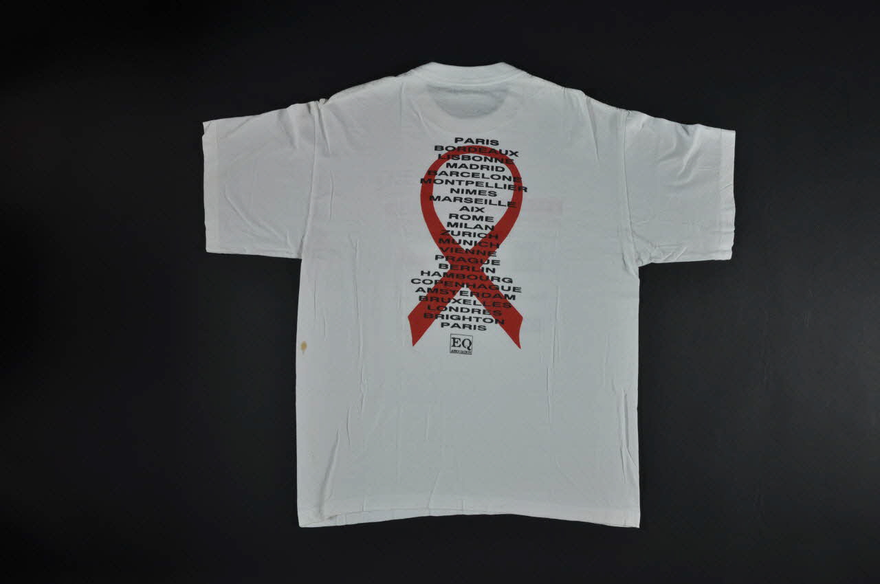 Tee shirt blanc à manches courtes et encolures rondes présentant, sur l'avant, le titre de l'opération, et les logos des partenaires : iea Paris, NRJ, P&O, Efnet, Megamark, CRIPS, AIDES, Le Kiosque.