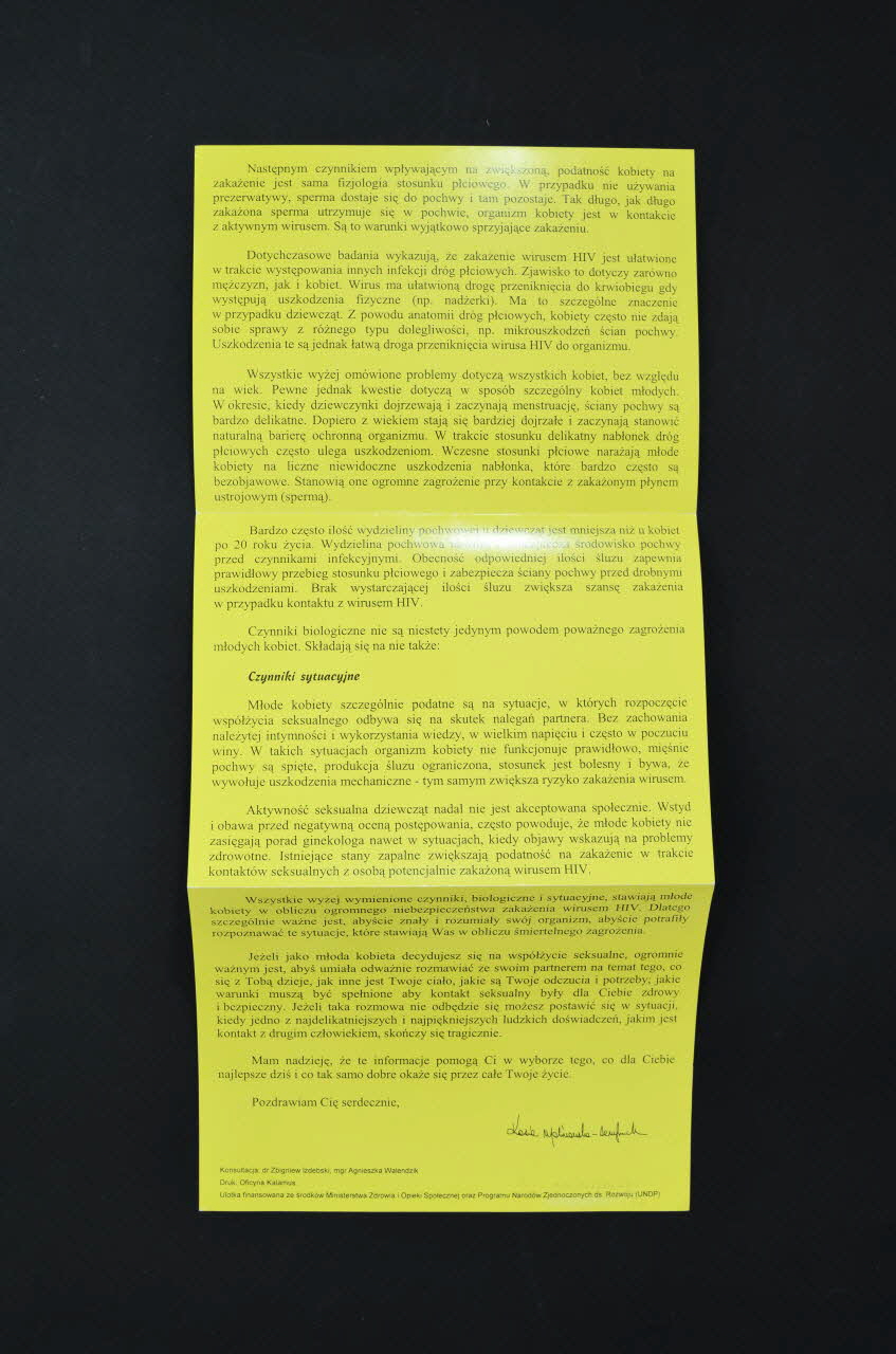 Sur la couverture on peut voir une grande photo en couleur d'un coucher de soleil devant la mer avec devant deux jeunes (garçon et fille), se tenant par la main, en vélo. En haut sur un bandeau jaune il y a le titre en capitales italiques rouges. A l'intérieur et au dos le fond est jaune et le texte est en noir, il s'agit d'une lettre en polonais, elle est signée à la fin.Inscriptions