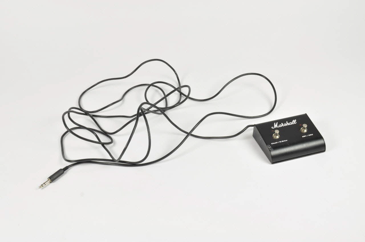 .1 : amplificateur. Caisse rectangulaire renforcée aux angles, contenant à la fois un préamplificateur et un amplificateur. L'avant est fermé par une grille de protection de couleur noire entourée d'un liseret blanc. Dans le bas figurent les réglages du préamplificateur sur fond de couleur jaune-or, avec deux interrupteurs dont un est lumineux, dix potentiomètres à baxandale, une entrée jack et une sortie pour pédale au pied. Sur le dessus est fixée une poignée en plastique noir, et une grille de ventilation de forme rectangulaire. A l'arrière, une grille de ventilation métallique est vissée, et surmonte une série de prises : une prise d'alimentation avec Terre, quatre sorties jack, un dispositif de choix de l'impédence. L'amplificateur repose sur quatre pieds circulaires évasés. L'inscription "Marshall" figure en lettres de plastique blanc sur la grille à l'avant. De nombreuses inscriptions accompagnent chaque sortie et bouton. .2 : baffle à pan, coupé - modèle pour guitare. L'avant est muni d'une grille. L'ensemble, en plastique noir, repose sur quatre roulettes et présente deux poignées sur les côtés. A l'arrière figurent deux sorties de cable. .3 : pédale, munie d'un boitier en plastique noir reposant sur un patin en mousse, duquel part une prise jack, se branche devant. Sur le dessus figurent deux interrupteurs en métal gris, associés à des led rouges.Inscriptions